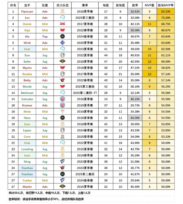 历年“大腿”统计(队伍胜率>50%&单赛季胜场MVP>=50%)