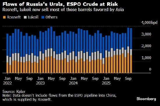 分析公司Kpler的数据显示,目前约有4800万桶俄罗斯石油公司和卢克石油公司的原油(主要为乌拉尔和ESPO等级)正在运输途中或即将装载。这其中包括约50艘驶往印度的油轮,但也包括一些没有目的地或驶往较小港口的油轮,这些油轮分散在从波罗的海到南海,中间商正在逐步退出这些原油贸易。