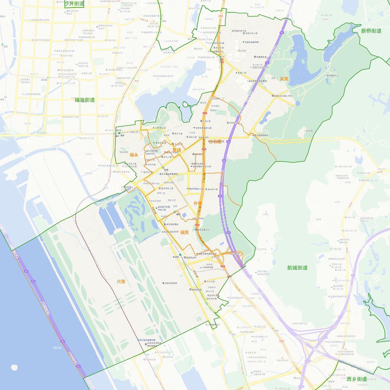 深圳市宝安区福永街道7个社区分布图 福永街道隶属广东省深圳市宝安区,地处宝安区西南部,西临珠江口,南与航城街道接壤,北与福海街道相连,东北角与石岩毗邻,中心位置为东经113°49′,北纬22°36′。福永街道辖区总面积37.6平方公里,政府驻地位于街道中心区。福永街道下辖兴围、福围、怀德、聚福、白石厦、福永、凤凰等7个社区。