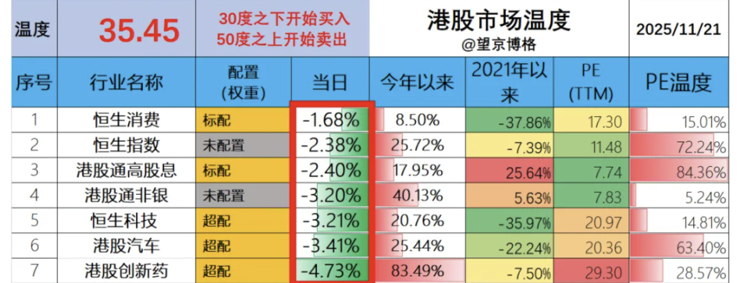 恒生消费、恒生科技、港股通创新药的市场温度均低于30度了,从长期角度看都是有配置价值的。
