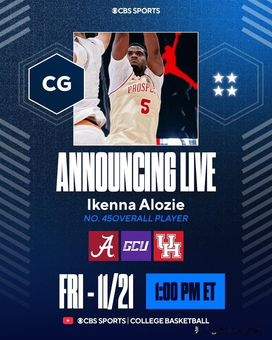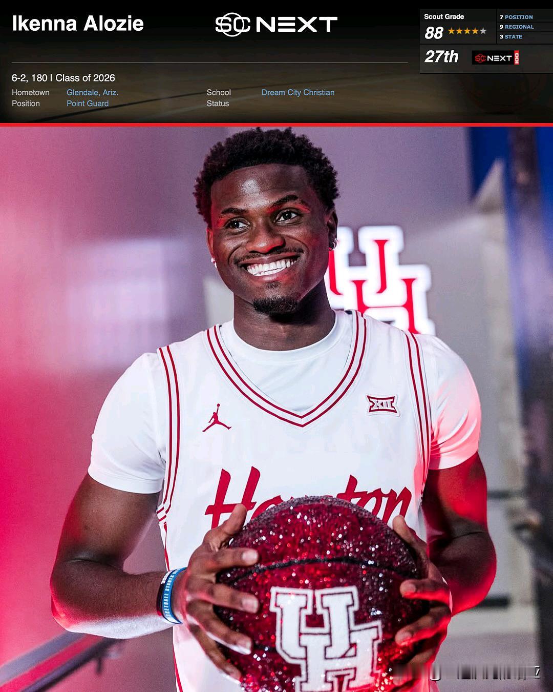 TOP40尼日利亚后卫Ikenna Alozie宣布承诺NCAA男篮 休斯顿大学,身高6-3=191,高中就读于亚利桑那州Dream City Christian,表示休斯顿是一个激励我的地方,让我为下一个阶段做好准备,这让我有宾至如归的感觉,美洲狮这届收到的第二位加盟者,之前还有几内亚中锋Arafan Diane。