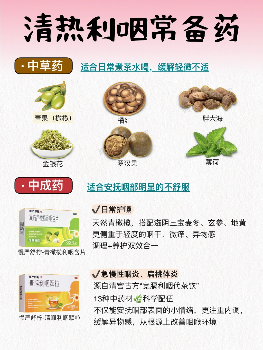 每到秋冬换季, 喉咙又开始闹脾气了![失望R] 尤其早上醒来,嗓子又干又难受, 咽干、咽痛、总有东西卡着似的…… 这时候可别急着乱吃药!先来“对号入座”, 看看你是哪一种咽痛? 🔥【外感风热——喉咙着火型】 ➡️特征:喉咙又红又肿,痰黄黏稠,感觉能喷出火来! ➡️对策:关键在清喉利咽,急需“灭火”处理!拖久了容易转成慢性咽炎。 ➡️方法:可以看看[向右R]慢严舒柠清喉利咽颗粒 冲一包,清清火气~配方源自清宫古方“宽膈利咽代茶饮”,含黄芩、西青果、桔梗等13味中草药🌿,清热利咽,把体内的热邪统统赶走,喉咙感觉清爽多了! 它不只是针对喉咙干、痒、痛,对慢性咽炎产生的喉咙异物感、刷牙干呕恶心也管用。 ❄️【外感风寒——喉咙紧涩型】 ➡️特征:喉咙发痒、微肿发紧,痰稀偏白,常伴有怕冷、鼻塞、流清涕。 ➡️对策:散寒解表+利咽舒缓 ➡️方法:可以试试[向右R]生姜红糖水或大葱须煮水,也可以生姜和葱须一起煮, 喝一碗,全身暖暖的,帮身体驱散寒气♨️,喉咙不再“瑟瑟发抖”~ 💦【阴虚肺热——喉咙干痛型】 ➡️特征:喉咙干痛、声音嘶哑,熬夜或说话多了更严重,口干舌燥,干咳少痰。 ➡️对策:要滋阴润肺,清热利咽 ➡️推荐方法:可以看看[向右R]慢严舒柠青橄榄利咽含片 含一片,润润喉咙~里面的青橄榄能清热利咽、生津解毒,再搭配“养阴三宝”——麦冬、玄参、地黄,协同作用,滋阴清热、利咽解毒。 一次含1-2片,药效缓缓释放,就像给喉咙做个舒缓SPA![偷笑R] 平时讲话多、熬夜后喉咙不适,拿来养护特别合适! [红色心形R][黄色心形R][蓝色心形R]【贴心小贴士】 风热别贪辣,风寒多保暖,阴虚少熬夜~ 搞清楚类型再调理,咽喉舒服,生活更轻松~ 快分享给你身边嗓子不舒服的朋友吧! 皖药广审(文)第 251231-02916号 皖药广审(文)第 251231-02934号