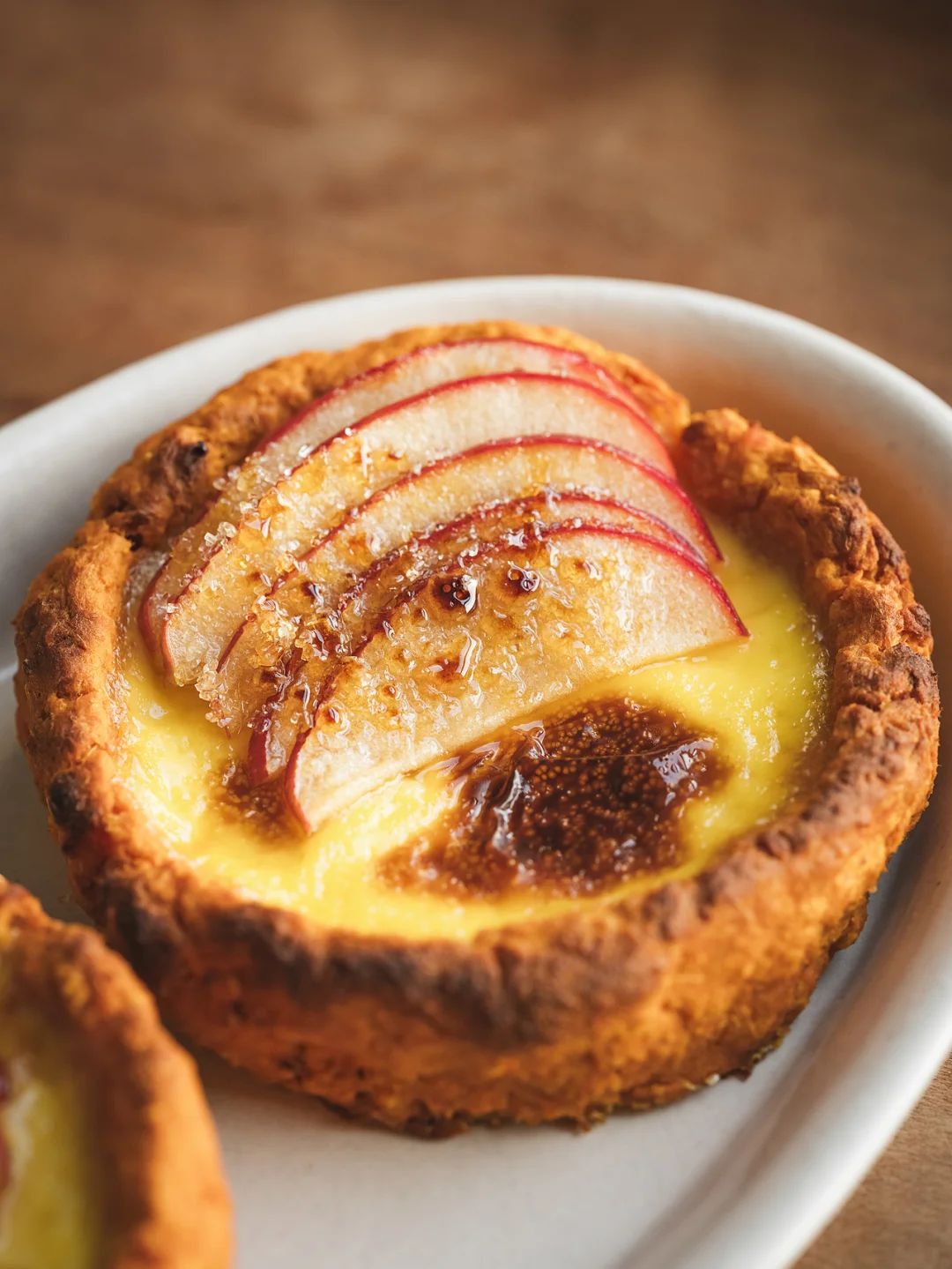 ❷加蛋挞液烤至上色,点缀苹果片并炙烤焦糖