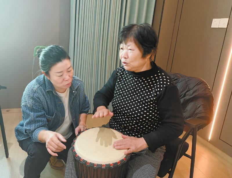 市老年大学金桥社区教学点老师在指导学员在非洲鼓。林菀茹摄