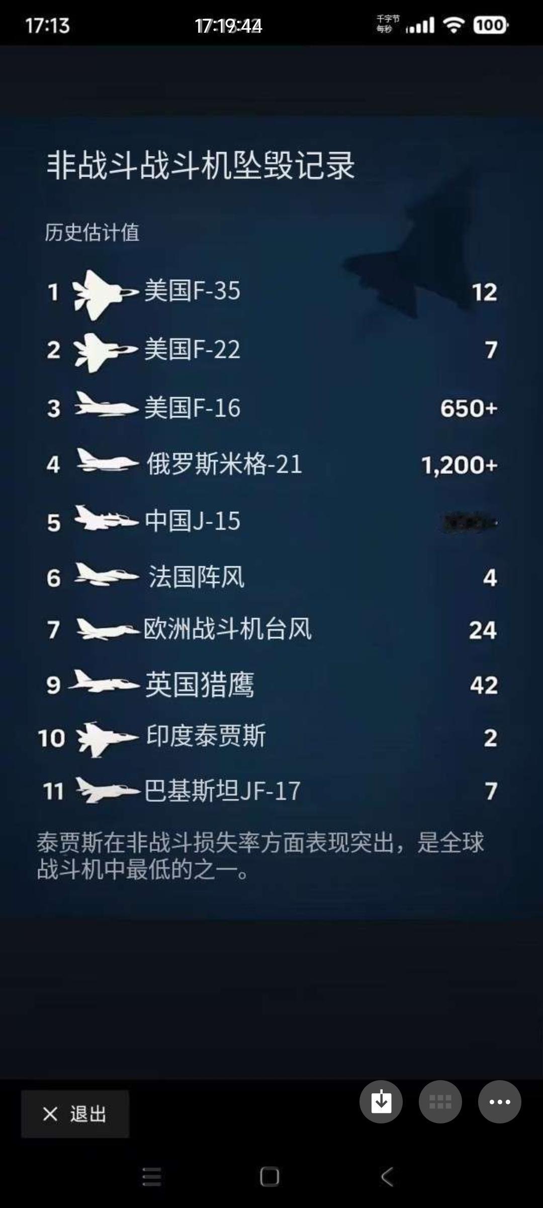 印度在宣传舆论方面非常积极手法也很离谱。 这是光辉战机坠毁后印度制作的全世界主流战机非战斗坠毁数量图。 可以看到,美国的f35坠毁12架,美国的f22坠毁了7架,美国的f16坠毁650架次+! 而光辉战机只坠毁两架! 印度民众看到后会非常高兴,四十年才两架多安全啊! 让人无语的是,印度还说中国的j15坠毁了300多架比,这完全是无稽之谈。这张表里面,印度有的飞机,坠毁次数都非常少,印度没有地方飞机,坠毁的数量都非常高。 最后印度得出一个结论,光辉战机是世界上最安全的主流战机! [捂脸]可这张表却不告诉印度民众,他们三十多年才生产三十架左右的光辉战机。 我查了一下相关数据:1952 - 2021年间,印度空军共损失1305名飞行员,且绝大多数死于非战斗任务; 2012 - 2021年这十年间,有73名飞行员遇难,平均每年牺牲7人以上;2015 - 2024年的十年里,印度空军损失104架飞机,期间也伴随大量飞行员丧生。 虚假宣传做的好,真的可以掩盖真相。 迪拜航展+1