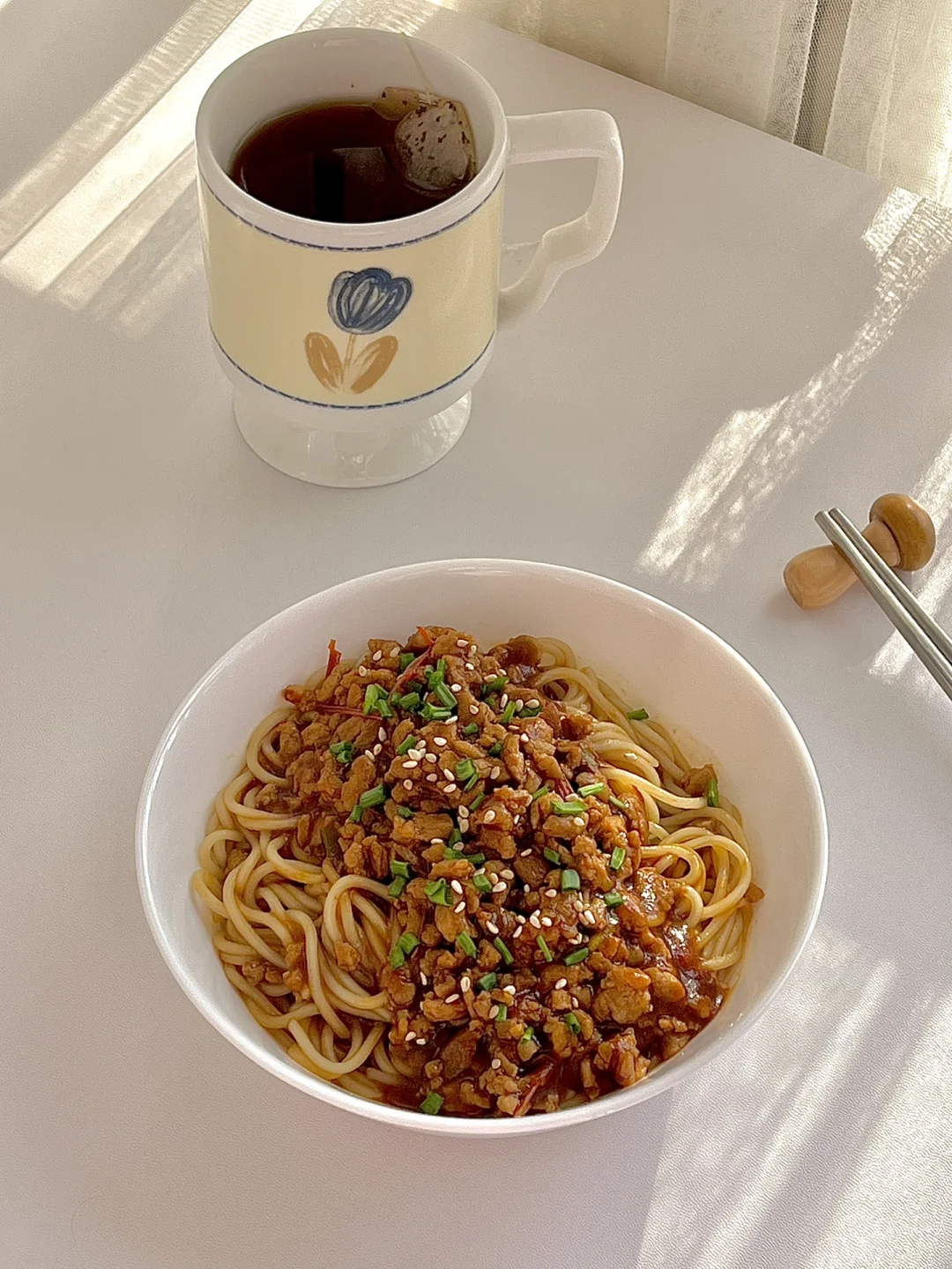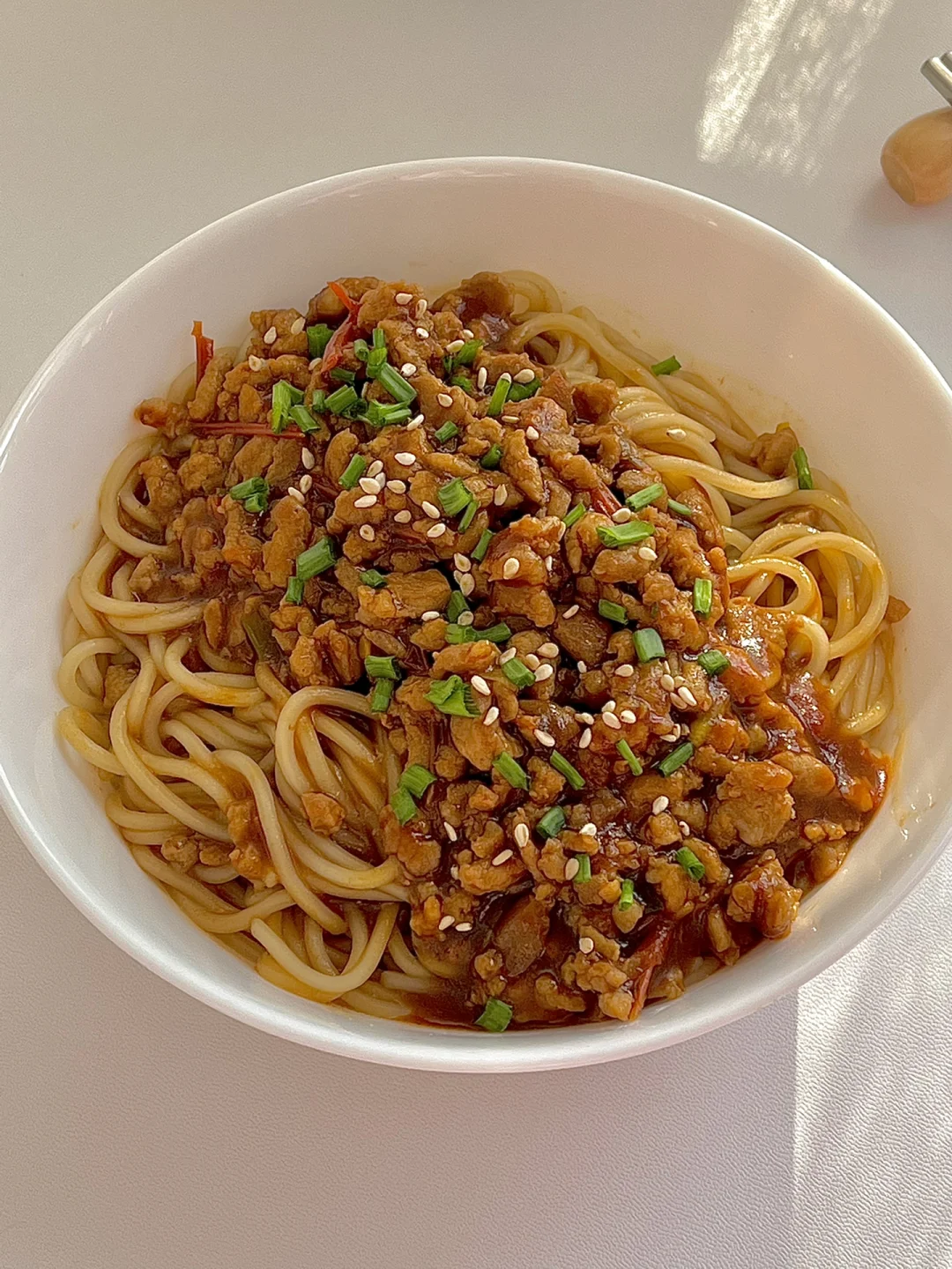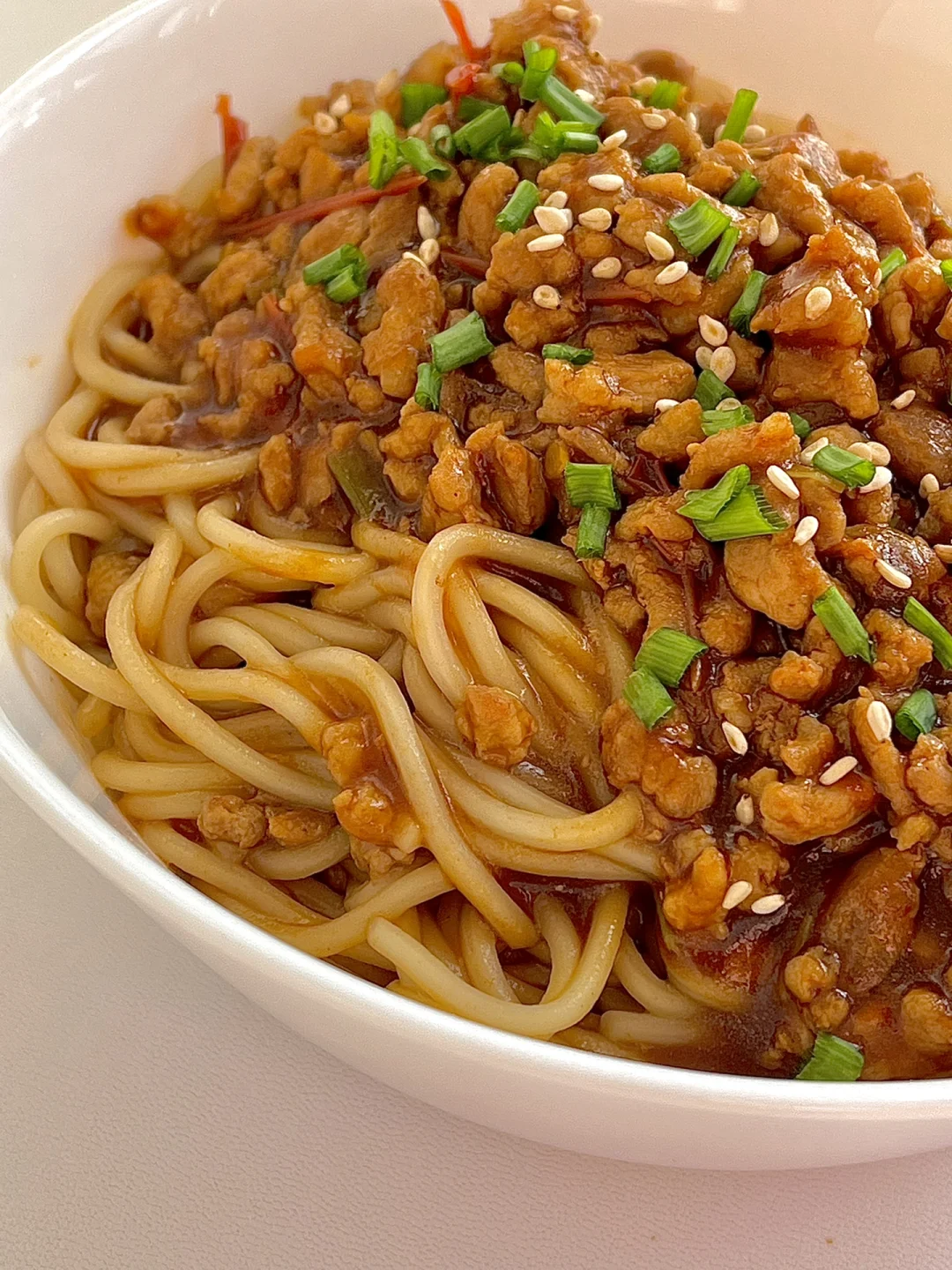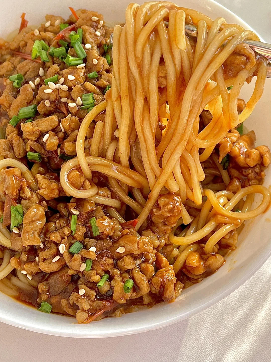 6️⃣面条捞出放在碗中,把炒好的肉末酱放在上面,吃的时候搅拌均匀即可。