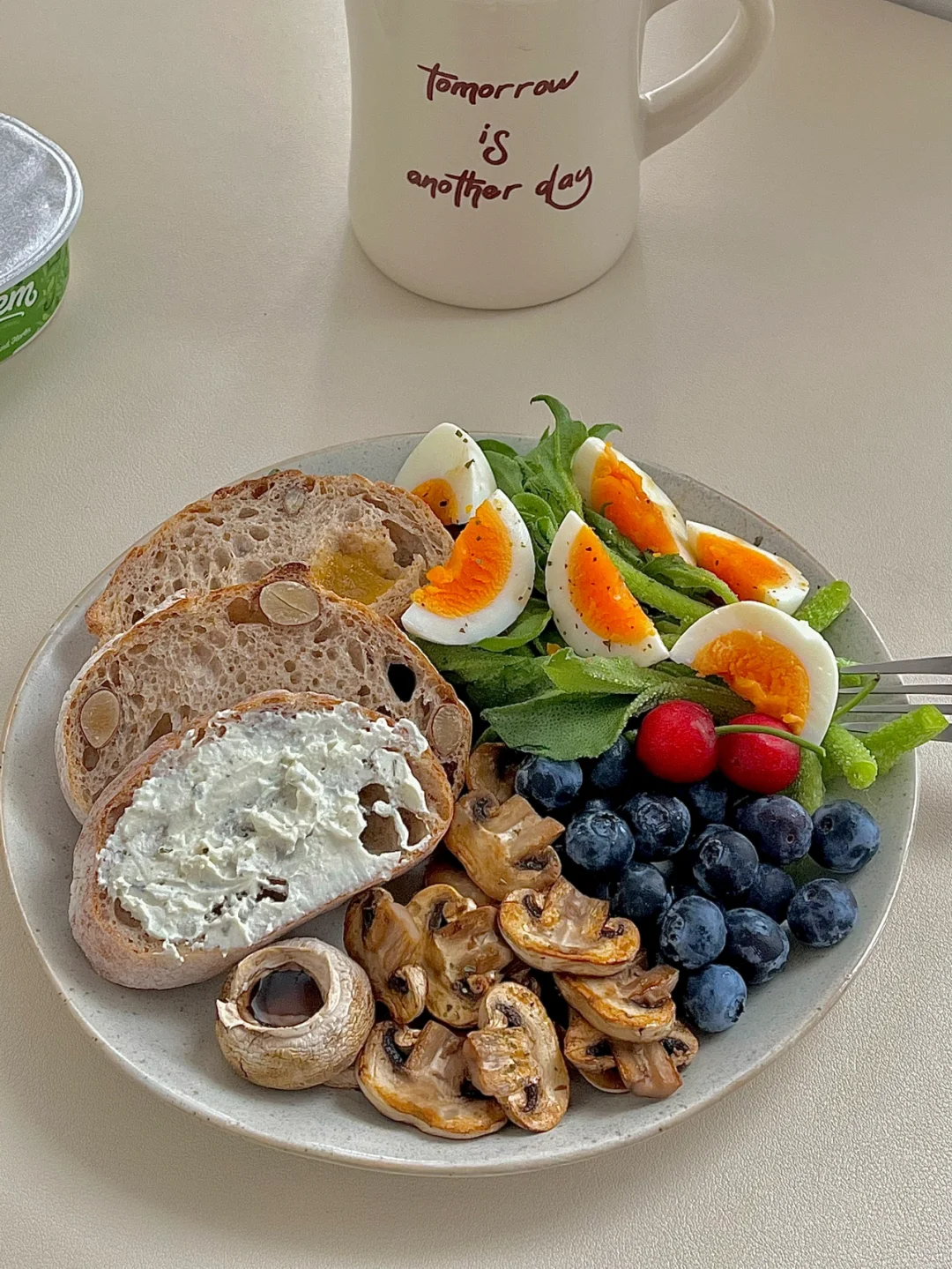 ☀️休息日早餐盘|黄桃坚果欧包vs冰草口蘑