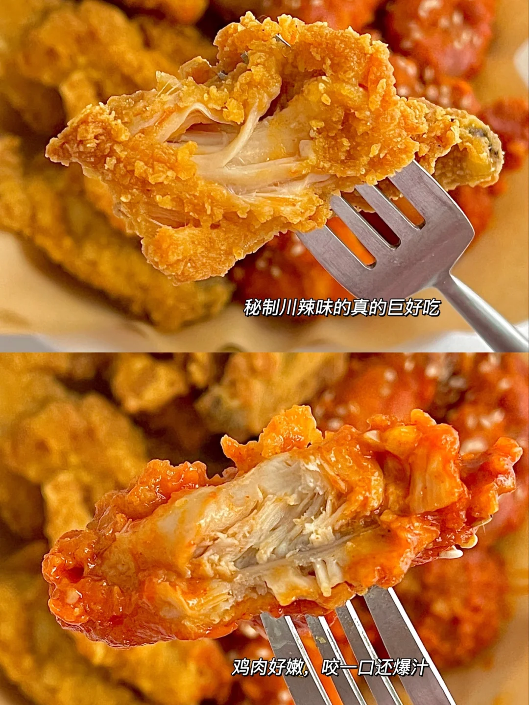 ✨鸡肉一点都不柴,而且一块炸鸡只有一根骨头,实实在在的肉。强烈推荐秘制川辣味的,真真的巨好吃😋