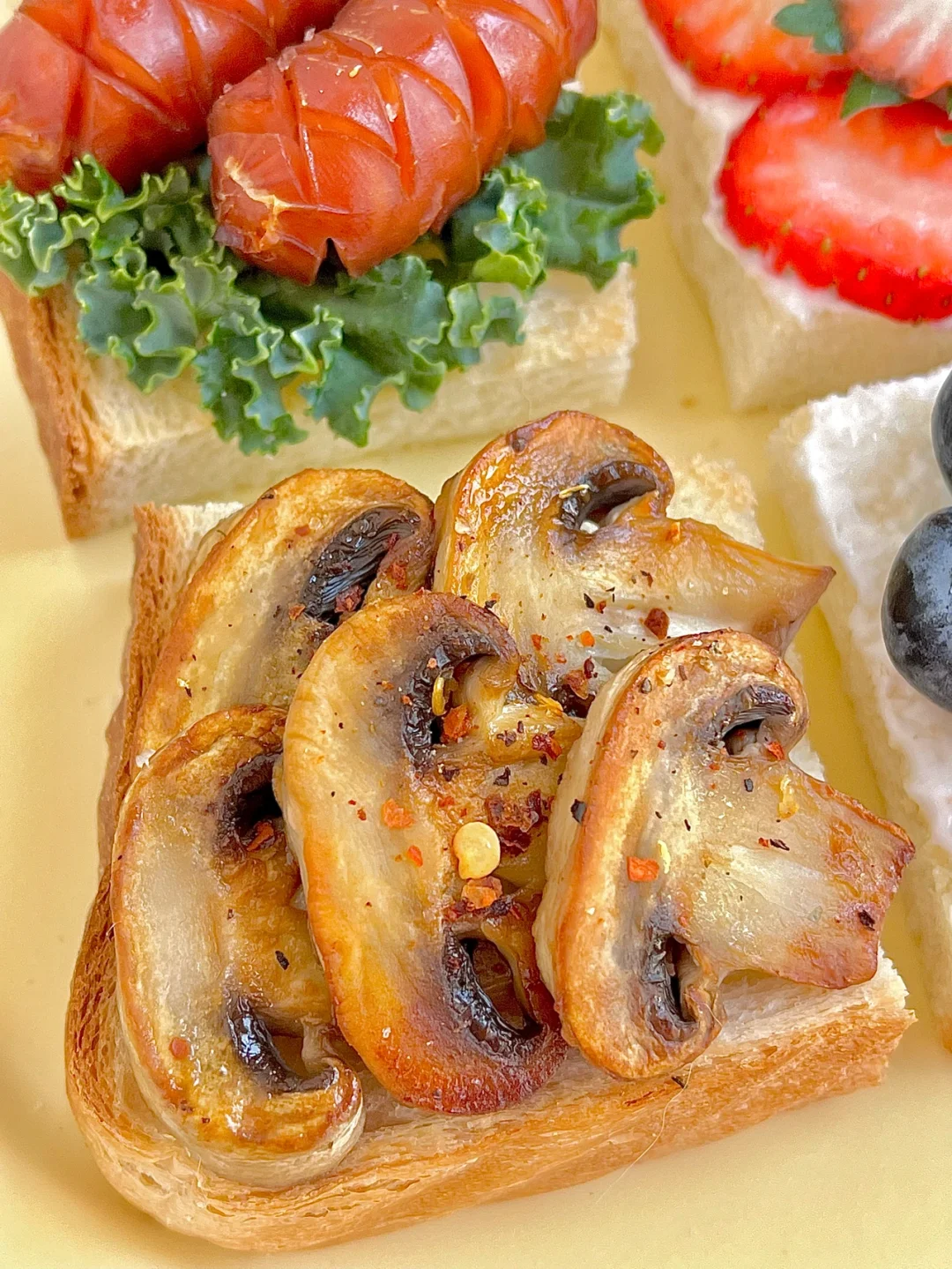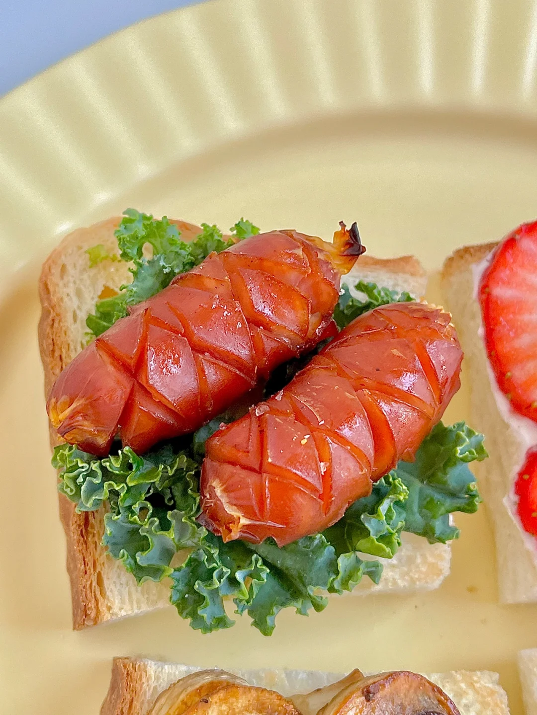 今日份早餐:四拼三明治(羽衣甘蓝香肠,黄油煎口蘑,酸奶草莓,酸奶蓝莓)一杯挂耳咖啡☕️ . 如果家里就剩下一片吐司,那就把它做成颜值高又好吃的四拼开放式吧😍 🍞一片吐司切成四块复烤一下,剩下的就自己随意搭配吧,想怎么摆都可以。可盐可甜😋,就是不太够吃,说实在的对我这个胃口大的,根本吃不饱😂