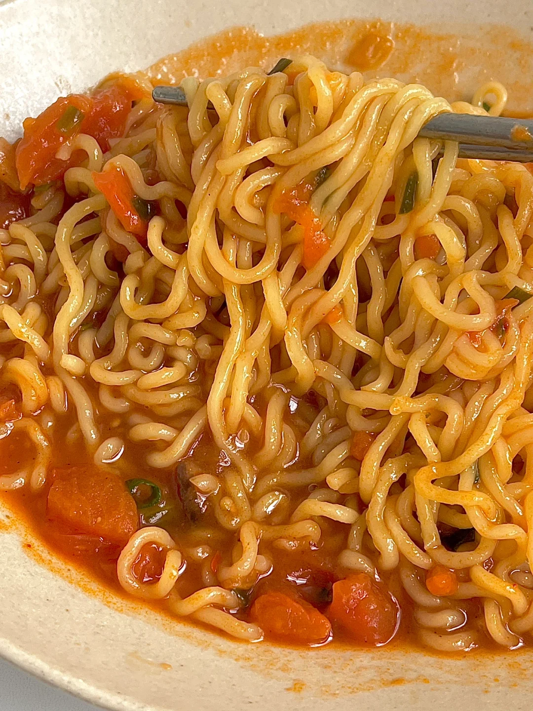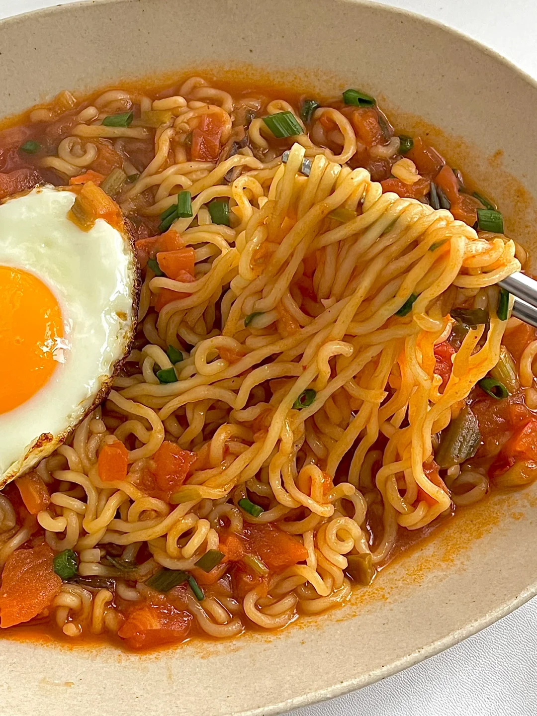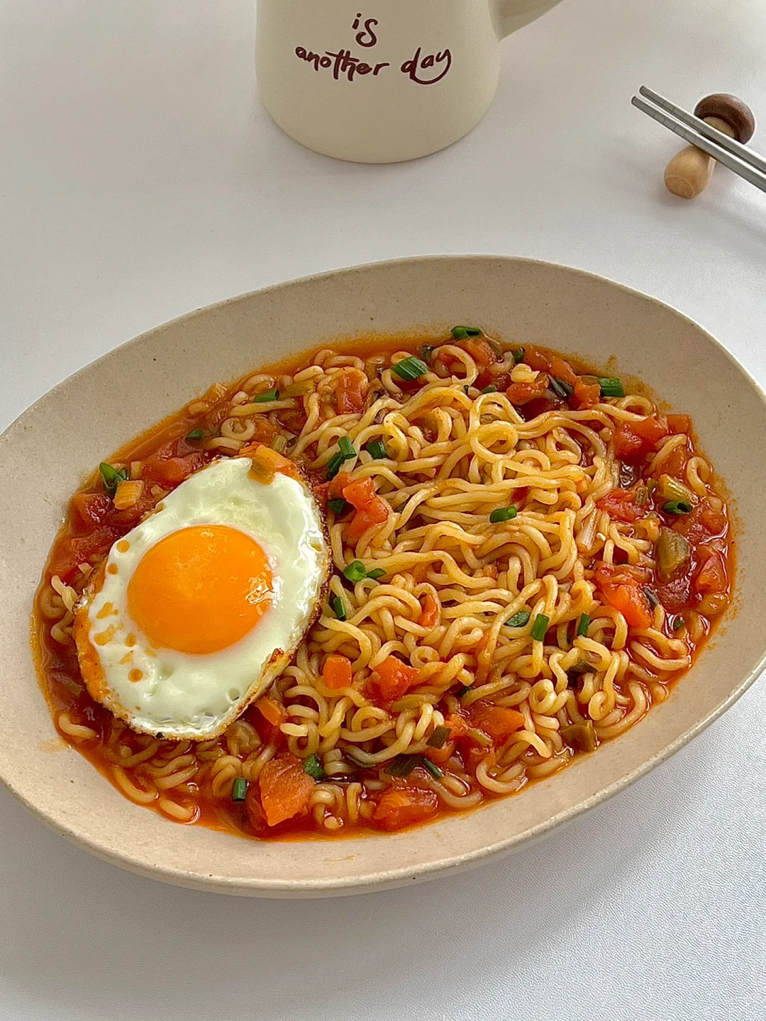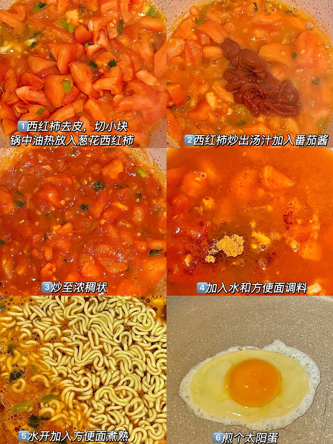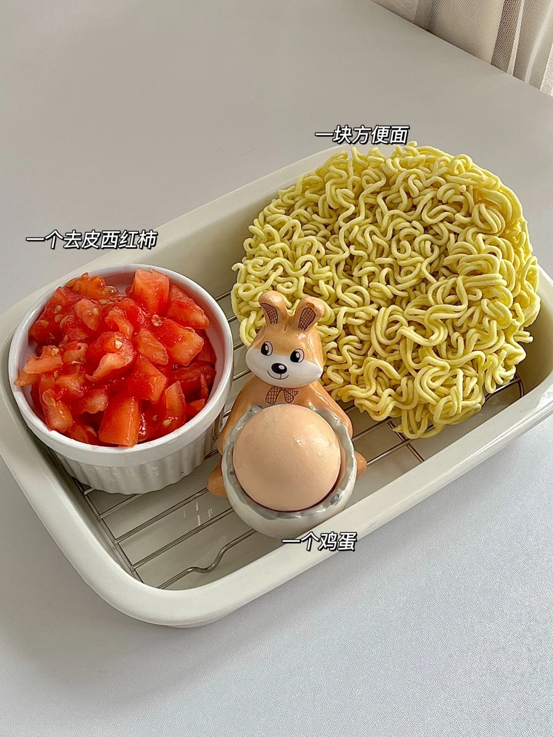 今日份早餐分享: 荷包蛋西红柿泡面🍅 一杯红茶☕️ . 🍜配料:一个西红柿 一个鸡蛋 一袋方便面 🍜做法: 1️⃣一个西红柿去皮切成小块。 2️⃣锅中油热放入葱花炒香,加入西红柿块炒出汤汁后加入番茄酱。 3️⃣西红柿炒浓郁后加入适量清水,加入方便面调料煮开。 4️⃣放入面饼煮3~5分钟。汤汁浓郁即可。 5️⃣煎个太阳蛋。煎好放在面上即可。 . 周末睡到自然醒,降温了就吃点热乎的吧!茄汁浓郁的泡面这样吃真的太好次了,不信你们也试试看😋 周末愉快呀!