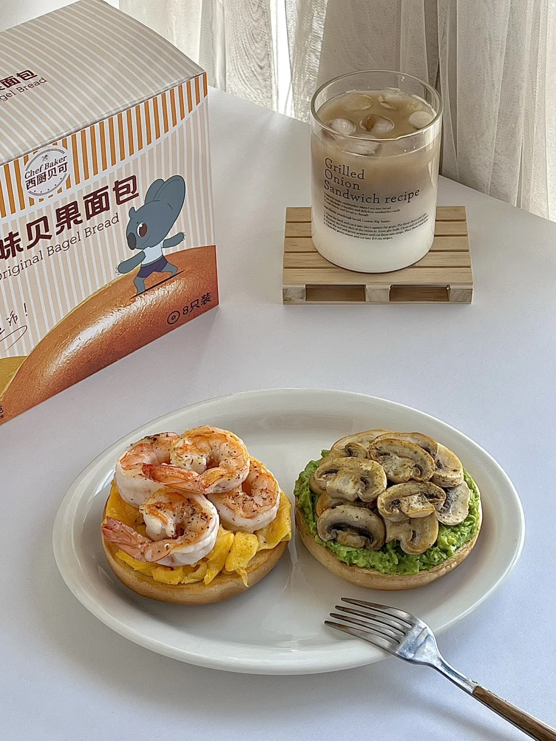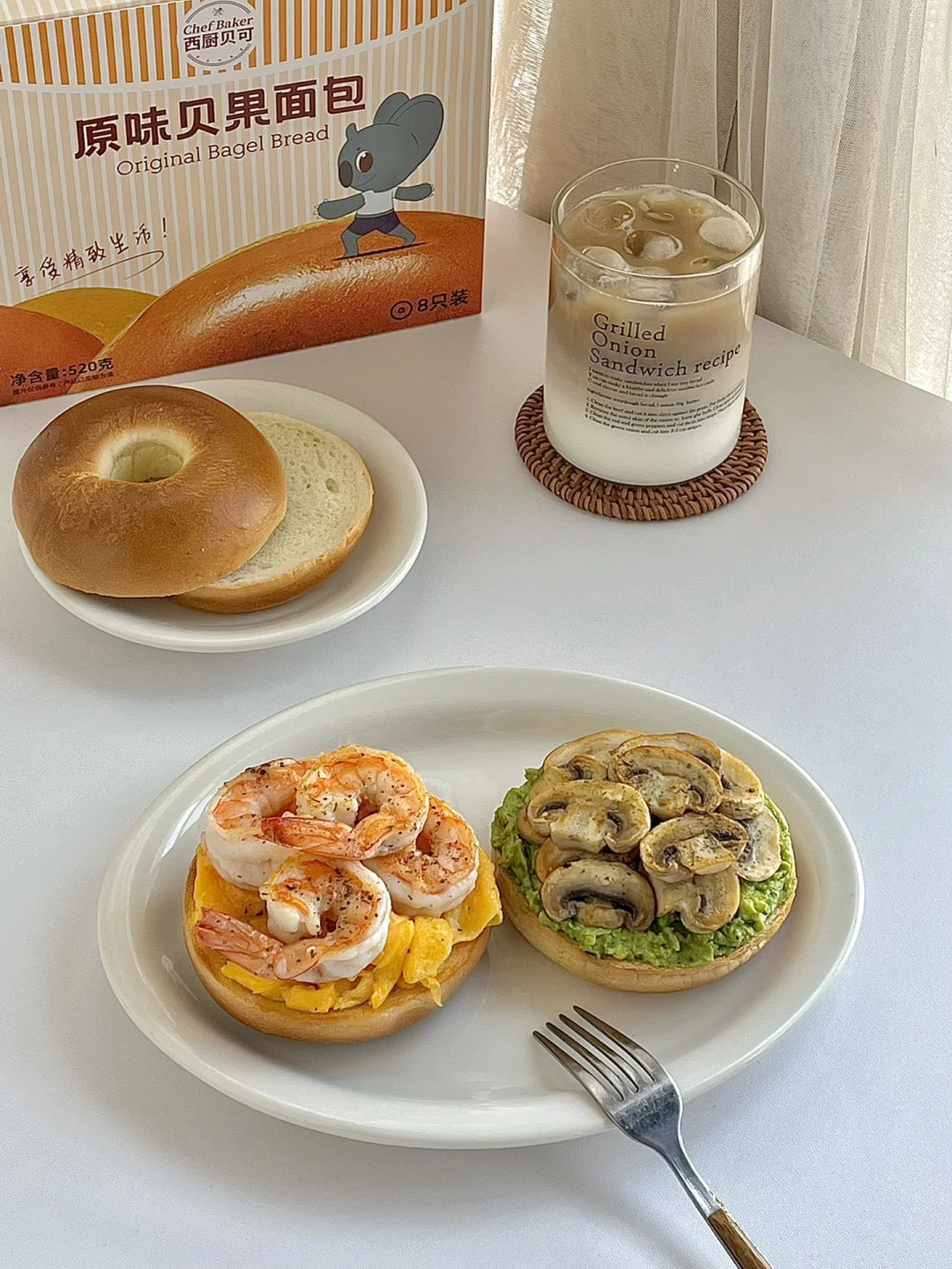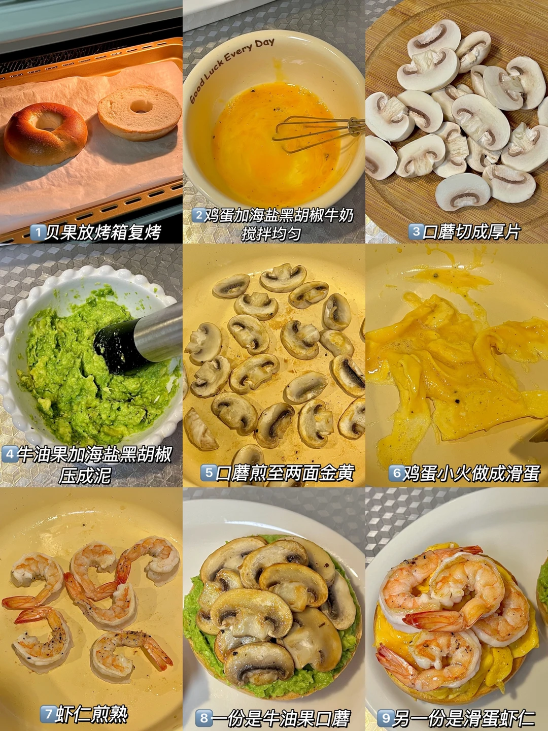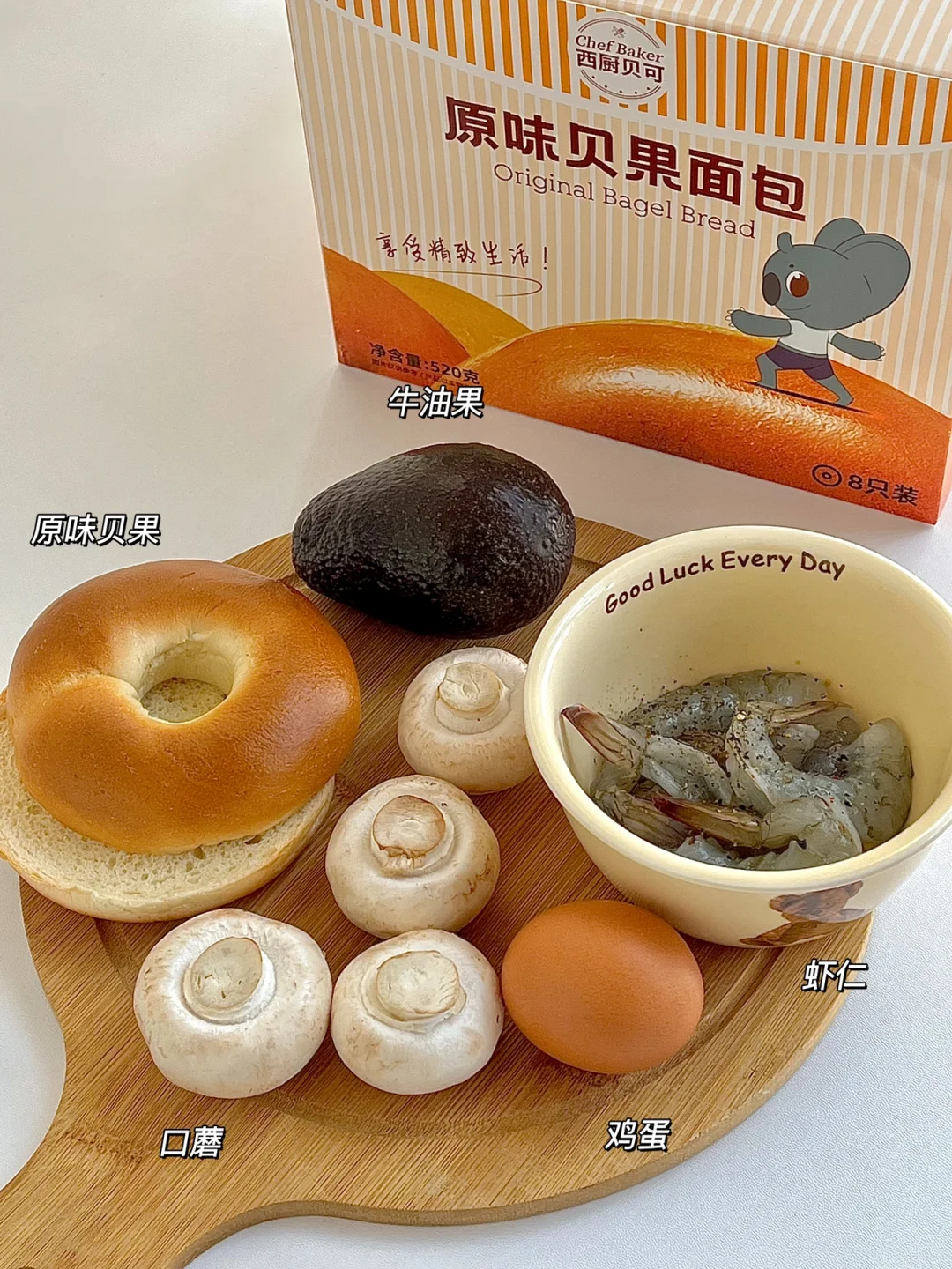 🥯食材:贝果一个 牛油果半个 口蘑四个 虾仁四个 鸡蛋一个