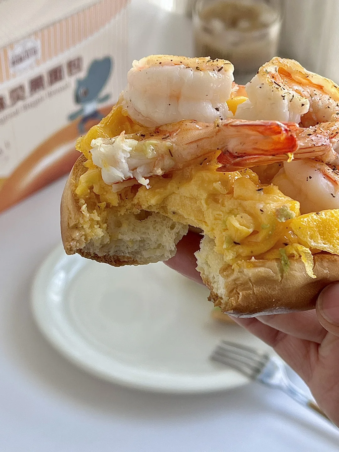 8️⃣另一片贝果放上滑蛋,再摆上虾仁。