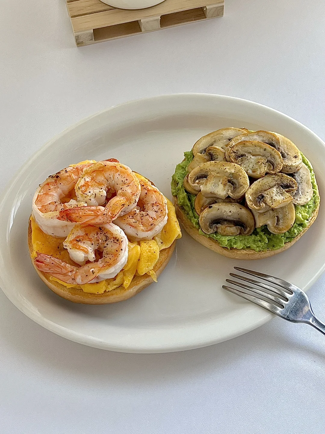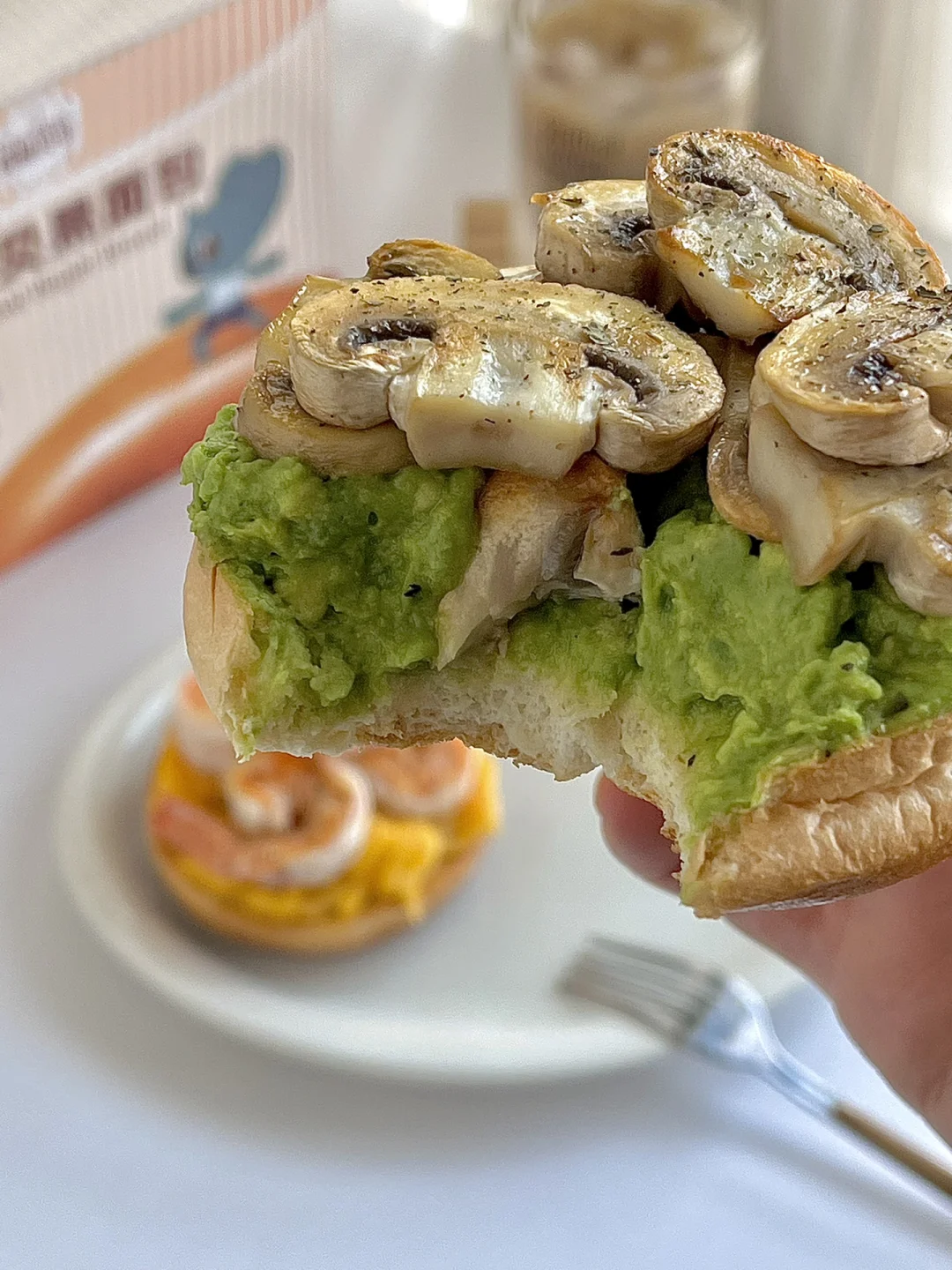 7️⃣一片贝果上涂满牛油果泥,放上煎口蘑。