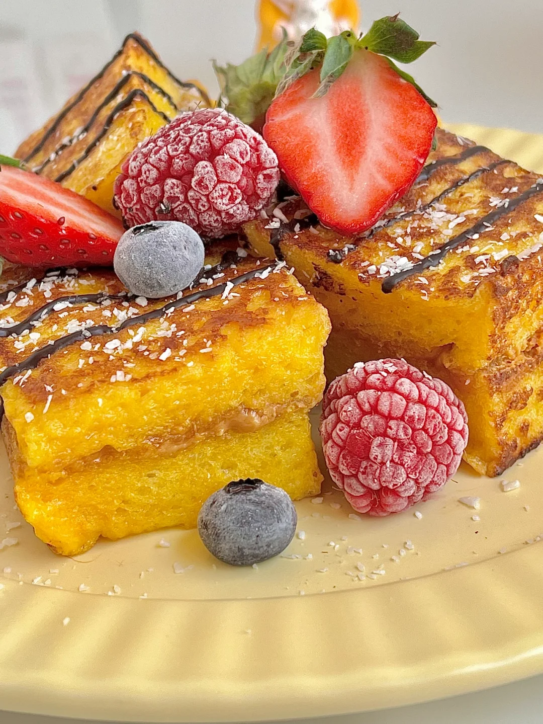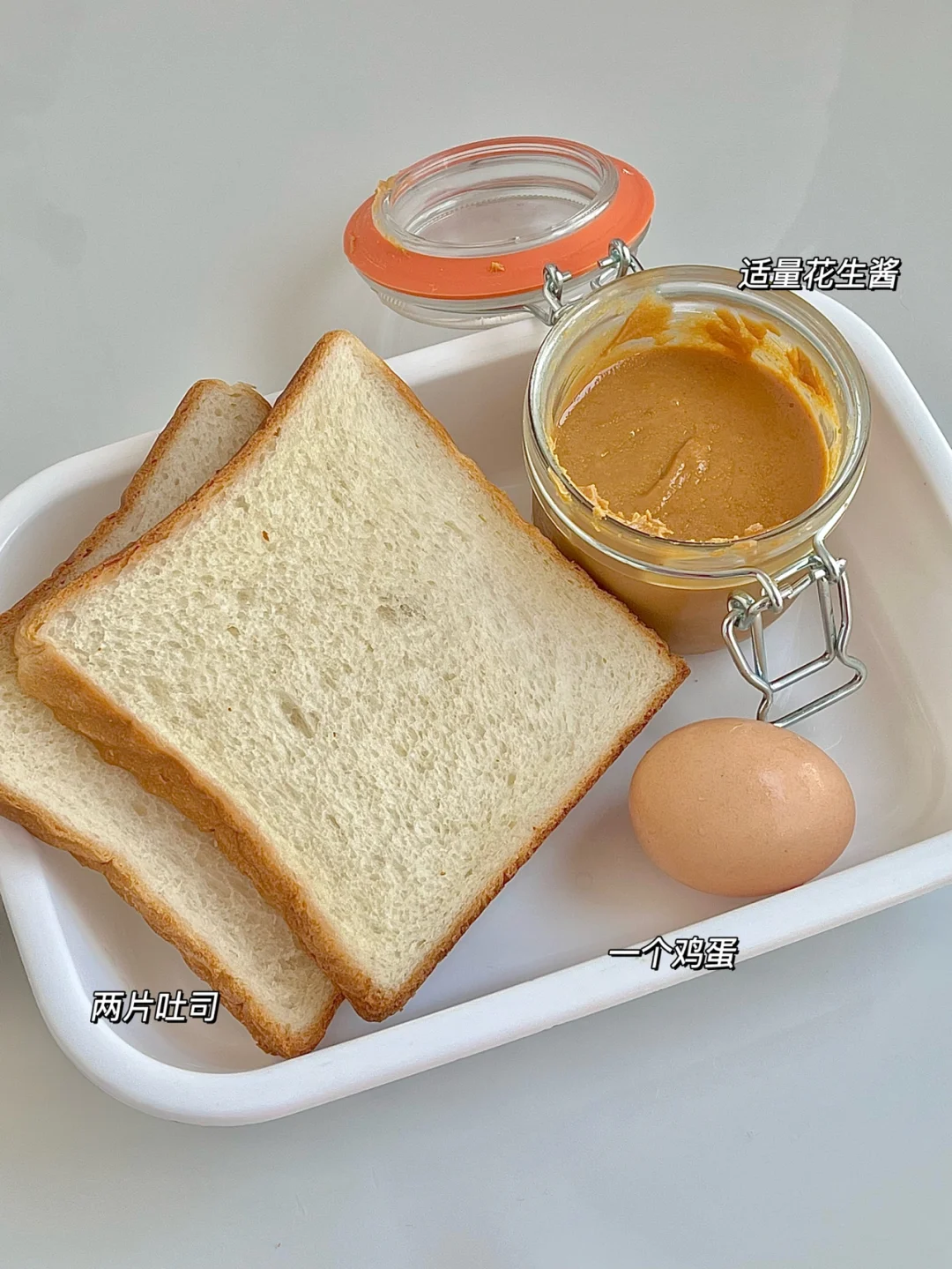 配料很简单,两片吐司,一个鸡蛋,花生酱适量,装饰的时候来点颜值高的水果🍓🫐