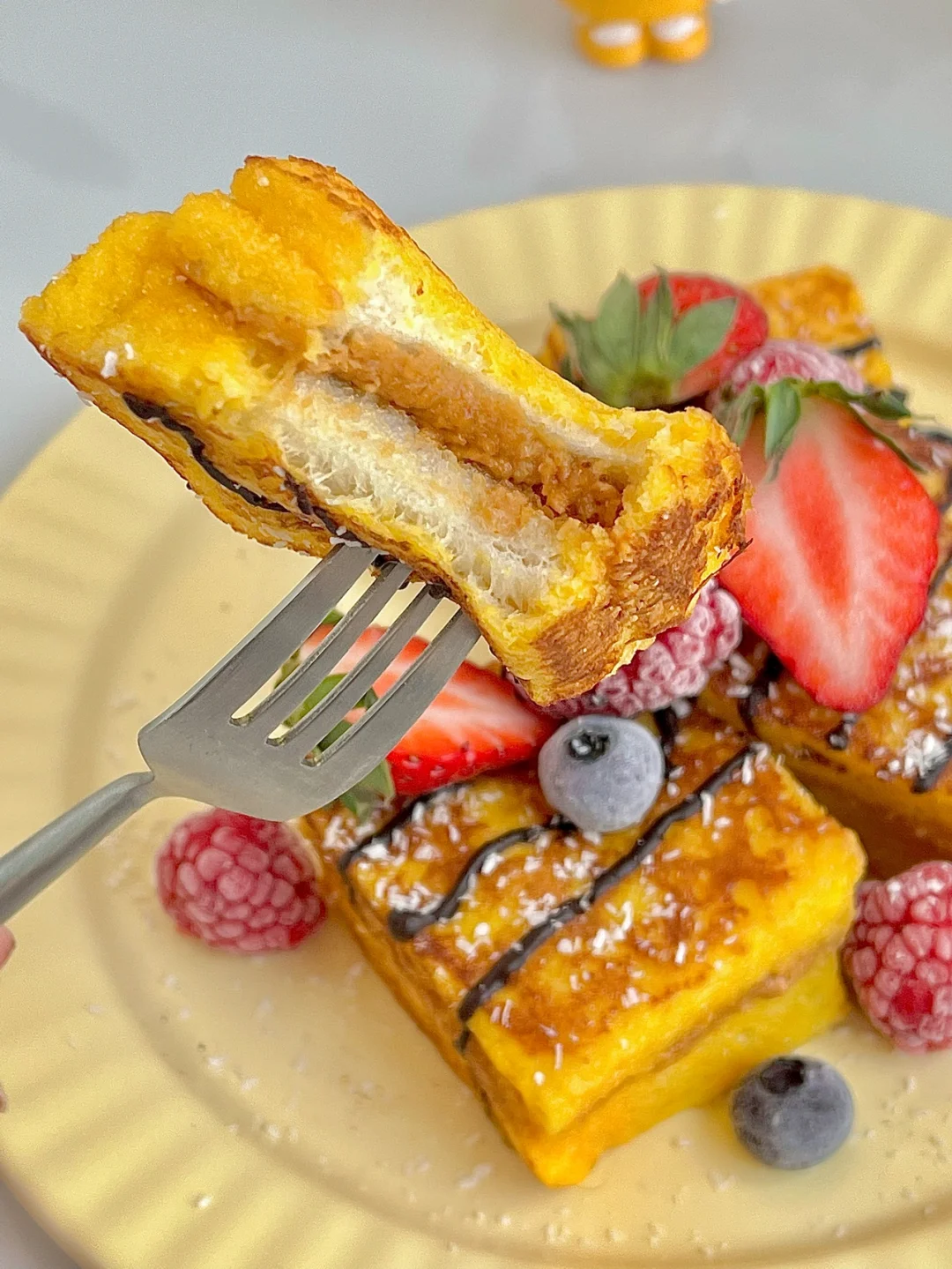 4️⃣鸡蛋打散可以加点牛奶进入,把组合好的吐司块四面都沾上蛋液。
