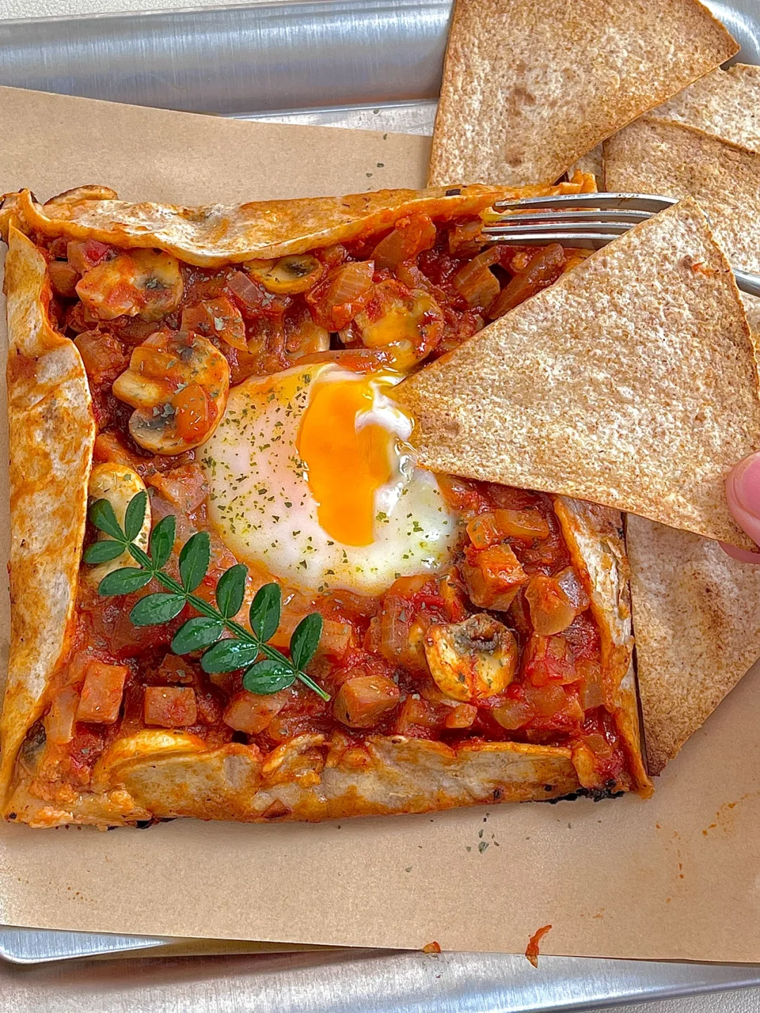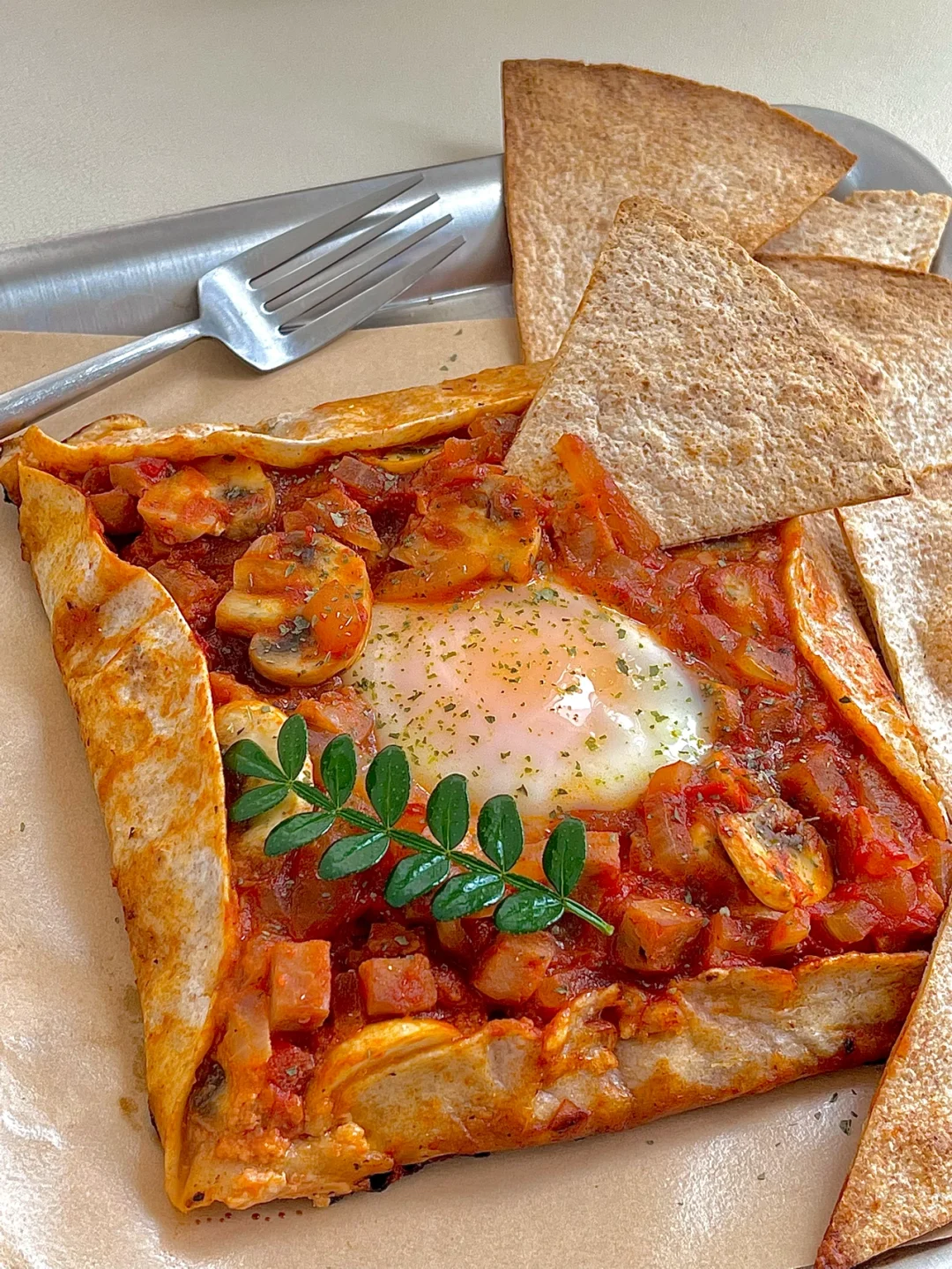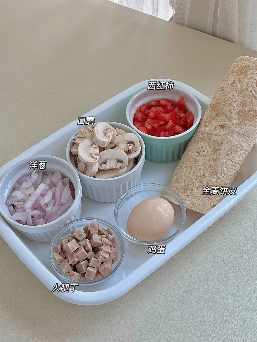 周末的悠闲早餐就要来点丰盛的,我这个塞的满满的快要撑破的饼皮虽然外形有点不好看,但是真的巨好吃😋你们一定要试试烤的全麦饼皮,嘎嘣脆的口感,配着北非蛋绝美!