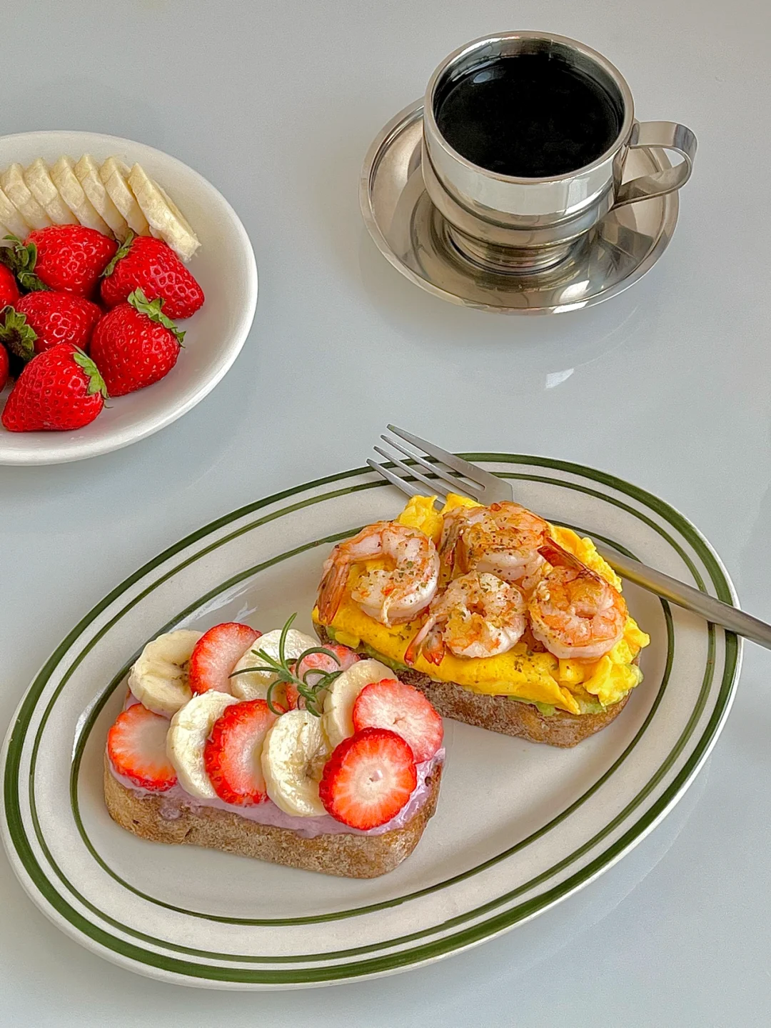 今日份早餐:草莓香蕉酸奶开放式,滑蛋虾仁牛油果开放式,草莓,香蕉,一杯热美式☕️ . 休息日有点忙,昨天都没来的及更新。 今的早餐依然简单,不知道吃什么来个开放式也是不错的选择呀!可盐可甜😋 . 祝大家周末愉快,最近降温宝宝们注意保暖