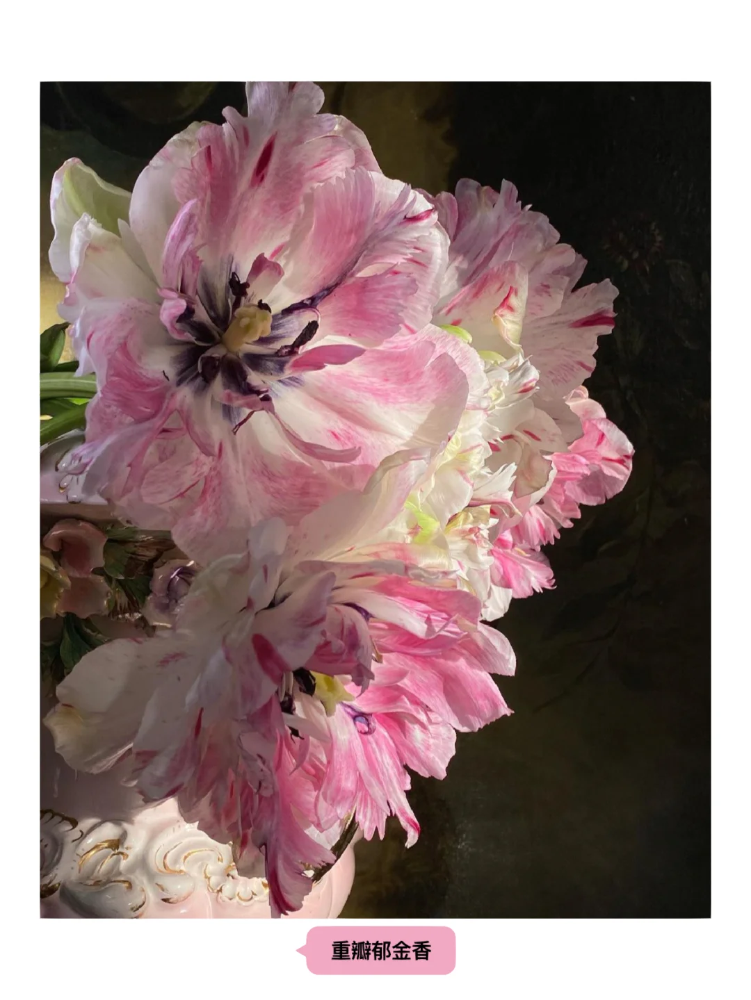 是法国郁金香的一种,重瓣带花纹。郁金香的颜值天花板。