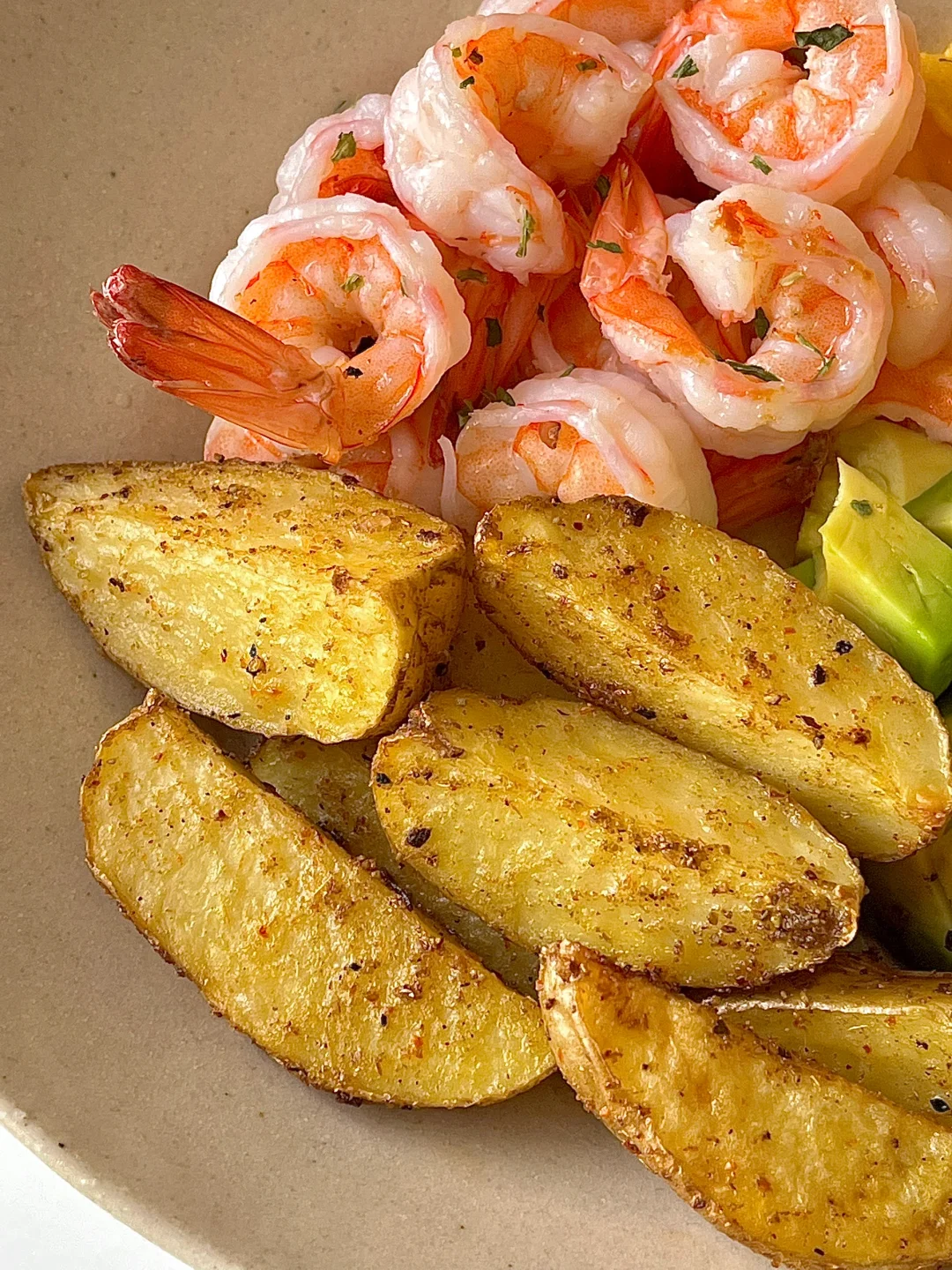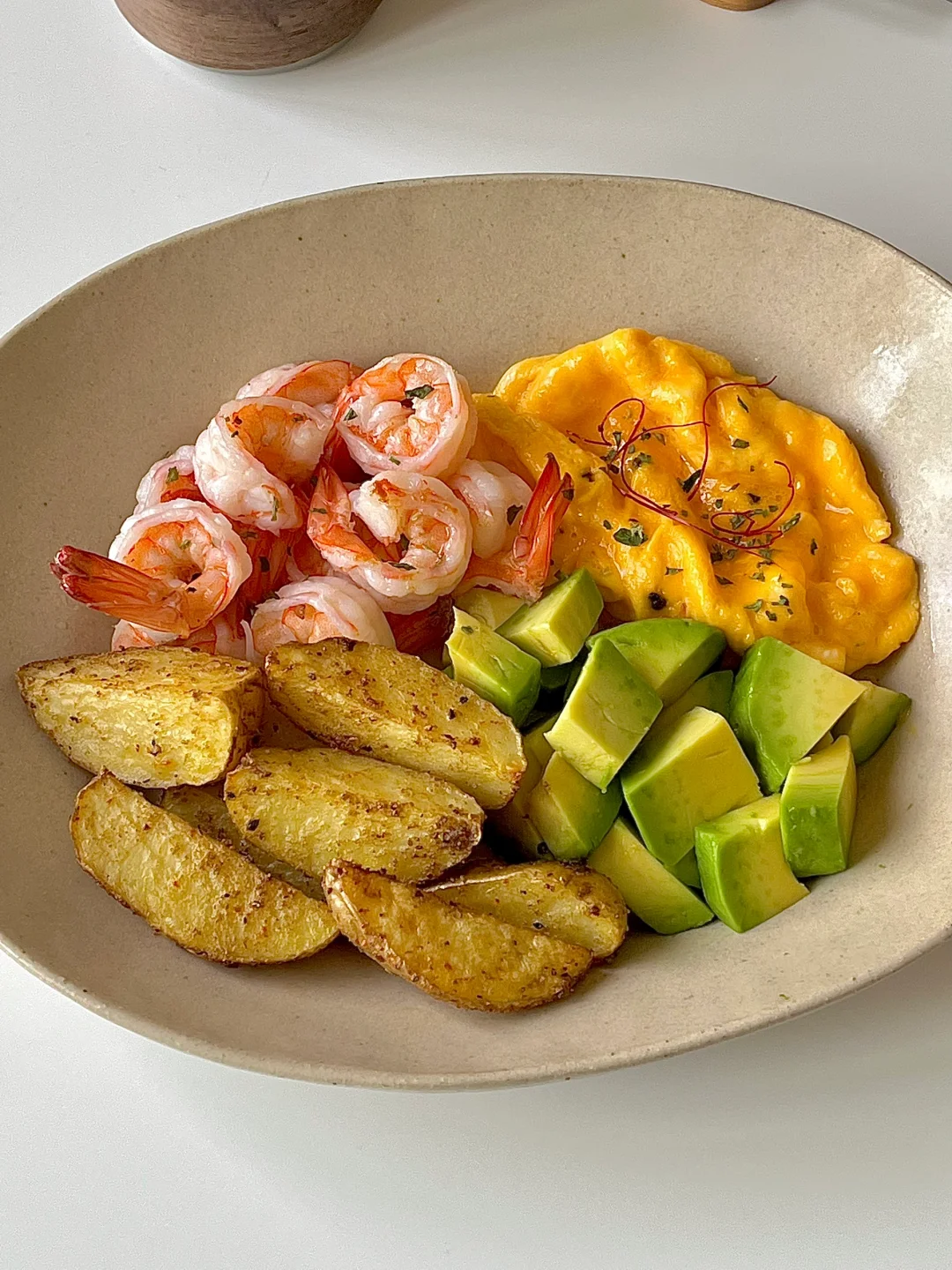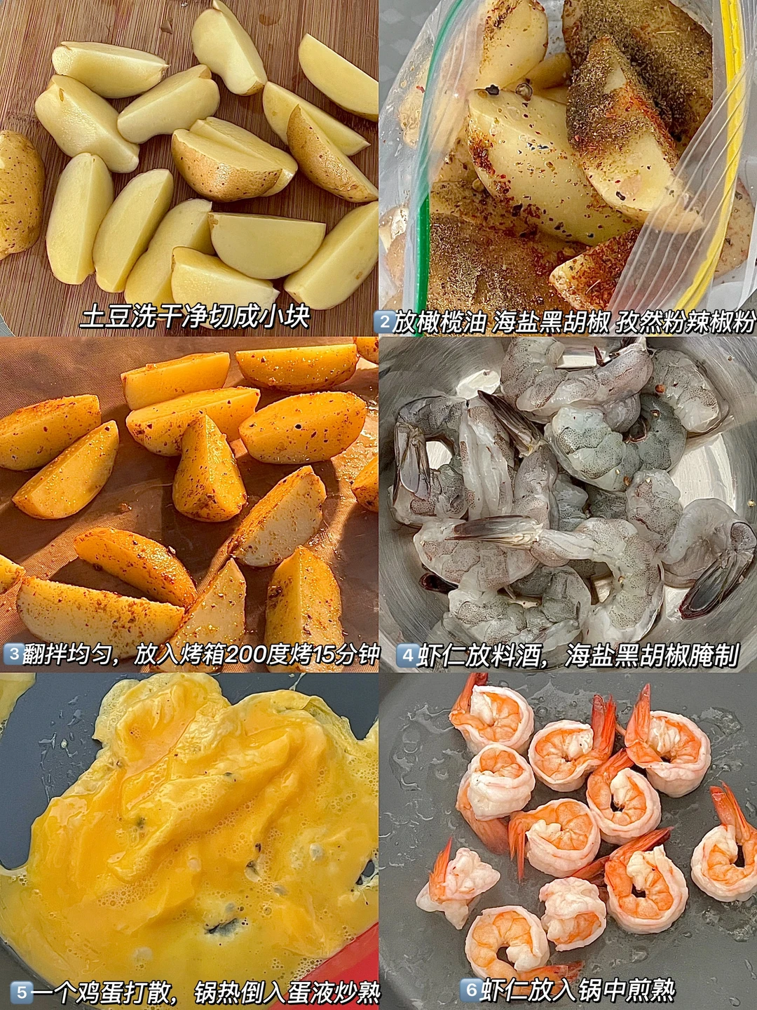 上班族的早餐 今日份早餐分享: 烤土豆🥔 煎虾仁 🍤 牛奶滑蛋 牛油果🥑 一杯冰美式☕️ 0 1️⃣土豆洗干净切成块(可以不用去皮,烤熟很容易去皮。也可以先去皮) 2️⃣放橄榄油,海盐黑胡椒,辣椒粉,孜然粉搅拌均匀,放入烤箱200度烤15分钟。 3️⃣虾仁放料酒,海盐黑胡椒腌制。 4️⃣锅中放少许油放虾仁煎熟即可。 5️⃣再做个牛奶滑蛋,切个牛油果🥑。 . 烤土豆和煎土豆我都爱吃😋可能就是爱吃土豆 觉得淡了,就沾点烧烤料吃,贼好吃😋