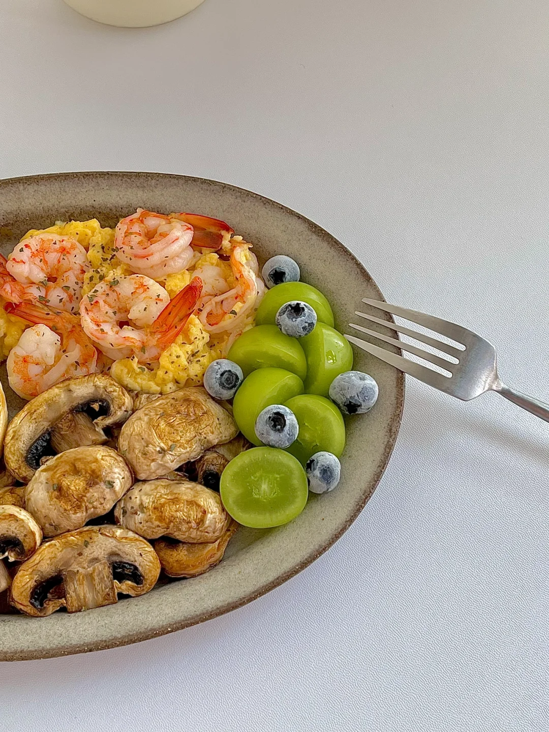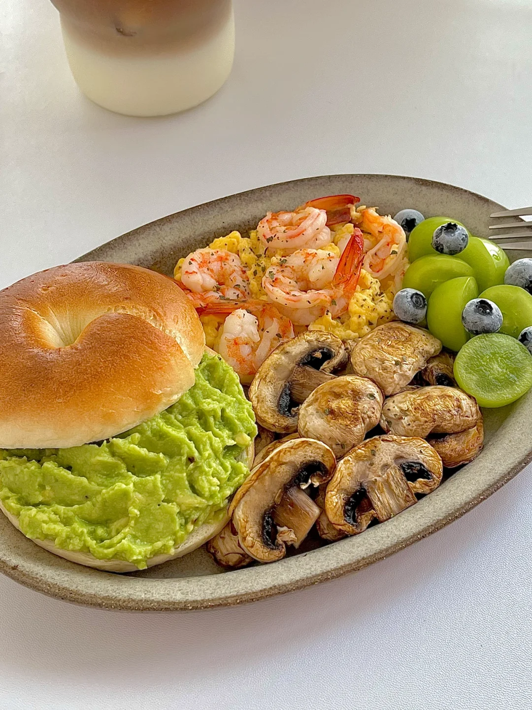 今日份早餐: 原味贝果搭配牛油果酱 虾仁滑蛋 煎口蘑 青提 蓝莓🫐 一杯冰拿铁☕️ . 拼拼凑凑又是一盘,口蘑被我煎干了😂 牛油果酱搭配原味贝果好吃😋 太热了,太热了,感觉要热化了