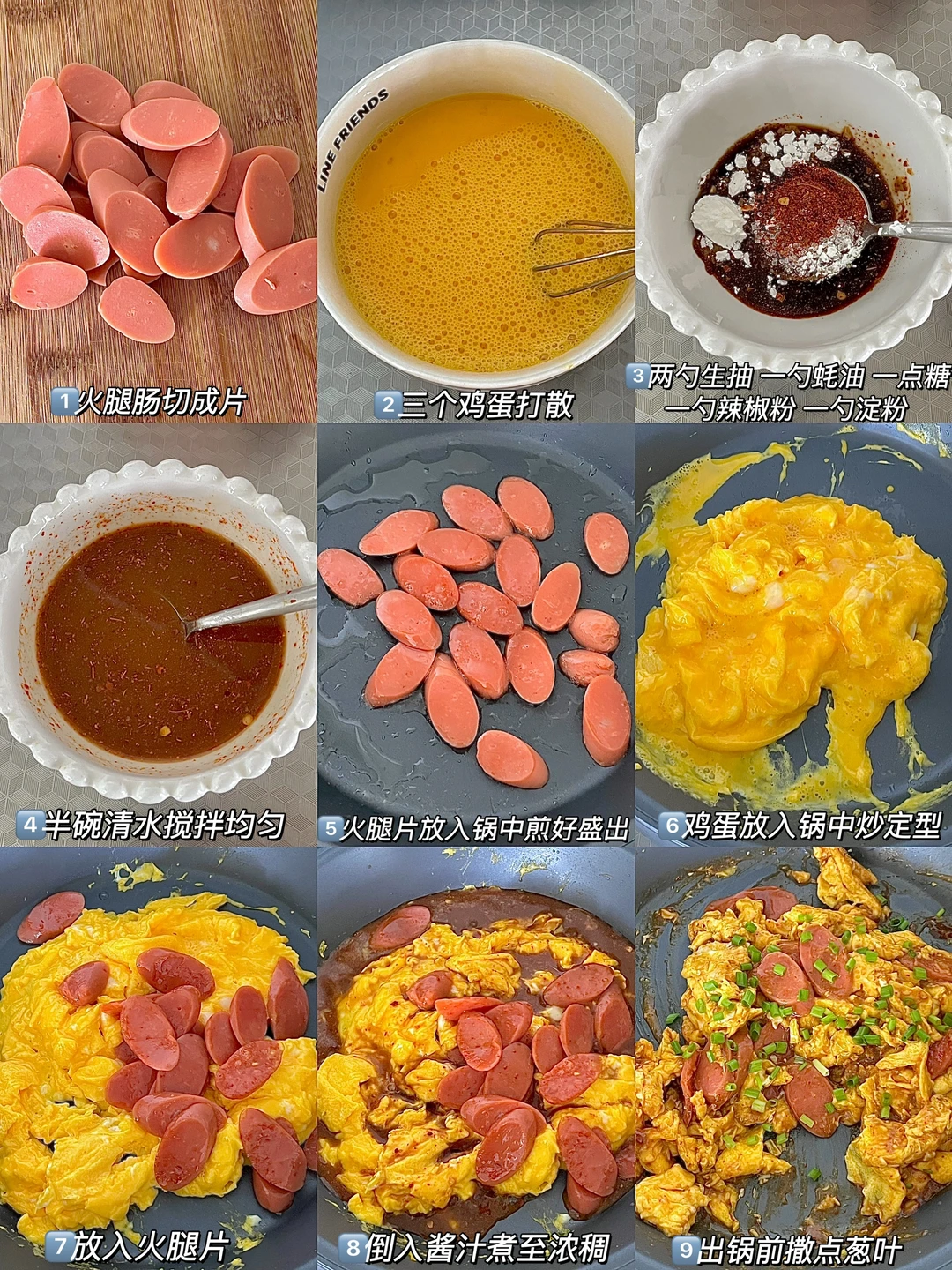 热气腾腾的三餐 今日份早午餐分享: 火腿炒饭盖饭 一杯美式☕️ . 1️⃣一根火腿肠切成片。 2️⃣三个鸡蛋加点清水打散。 3️⃣调个酱汁(两勺生抽 一勺蚝油 一勺淀粉 一点糖 一勺辣椒粉 半碗清水)搅拌均匀。 4️⃣锅中油热先放火腿片煎一下,盛出备用。 5️⃣锅中再放油,把蛋液倒进去,炒至定型。 6️⃣放入火腿片,倒入酱汁,炒至浓稠,出锅撒葱花。 . 我是个很喜欢吃鸡蛋的人, 感觉鸡蛋跟什么搭配都好好吃😋 今天的火腿肠炒蛋真的嘎嘎好吃,巨下饭
