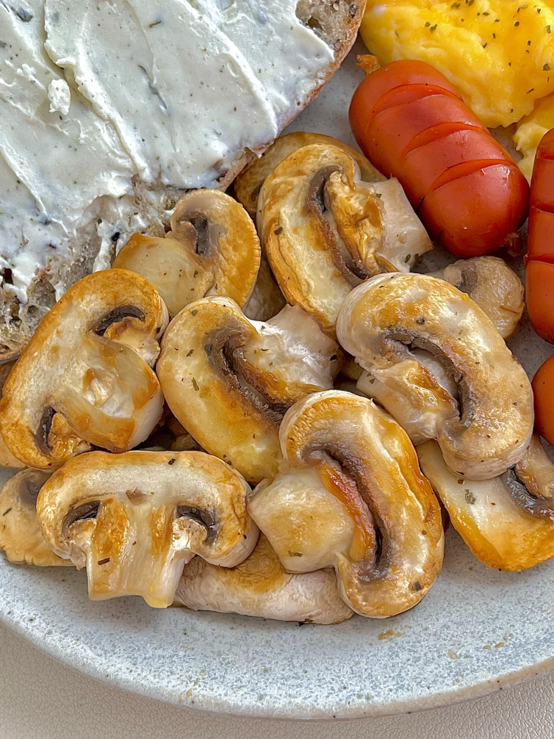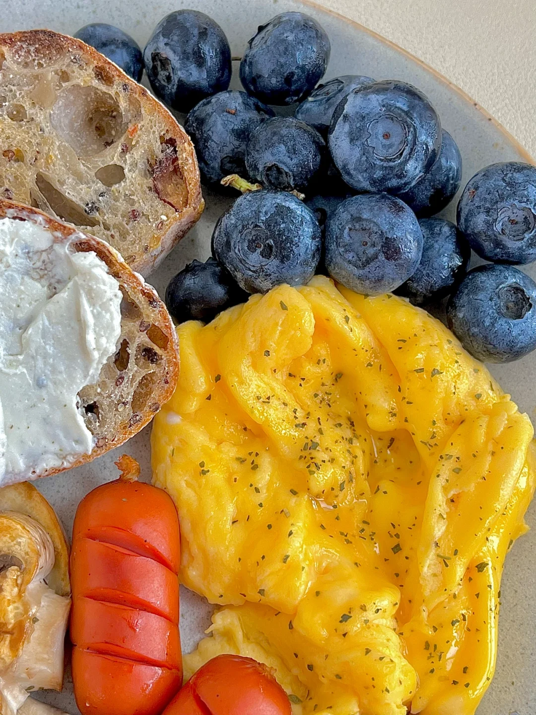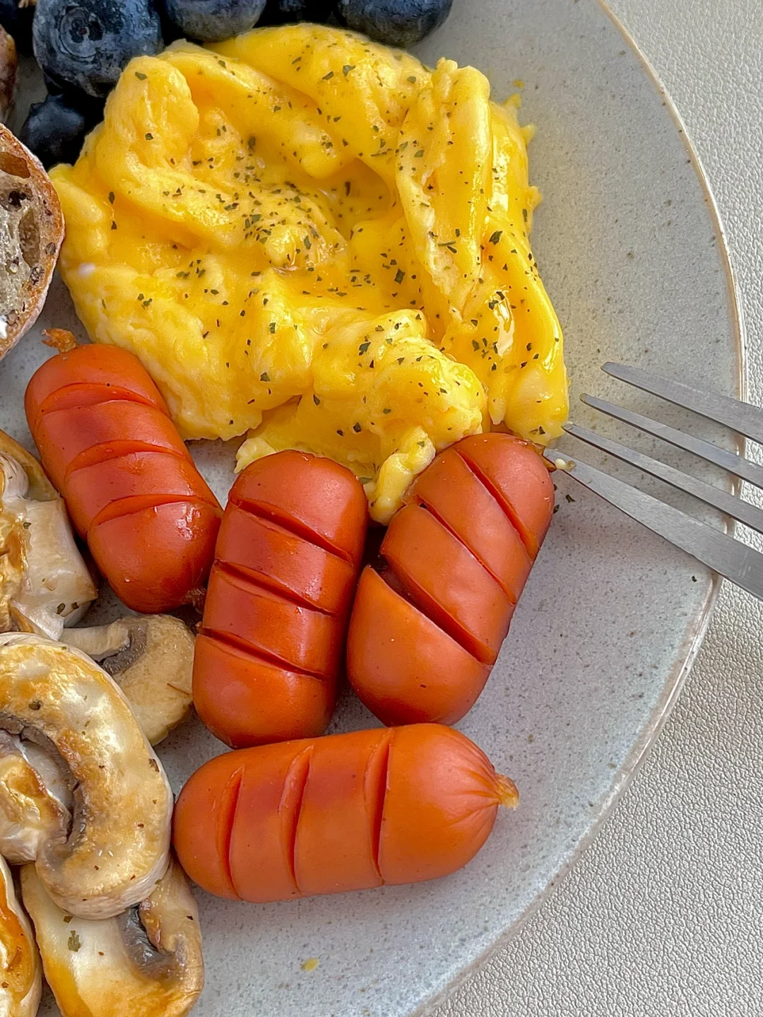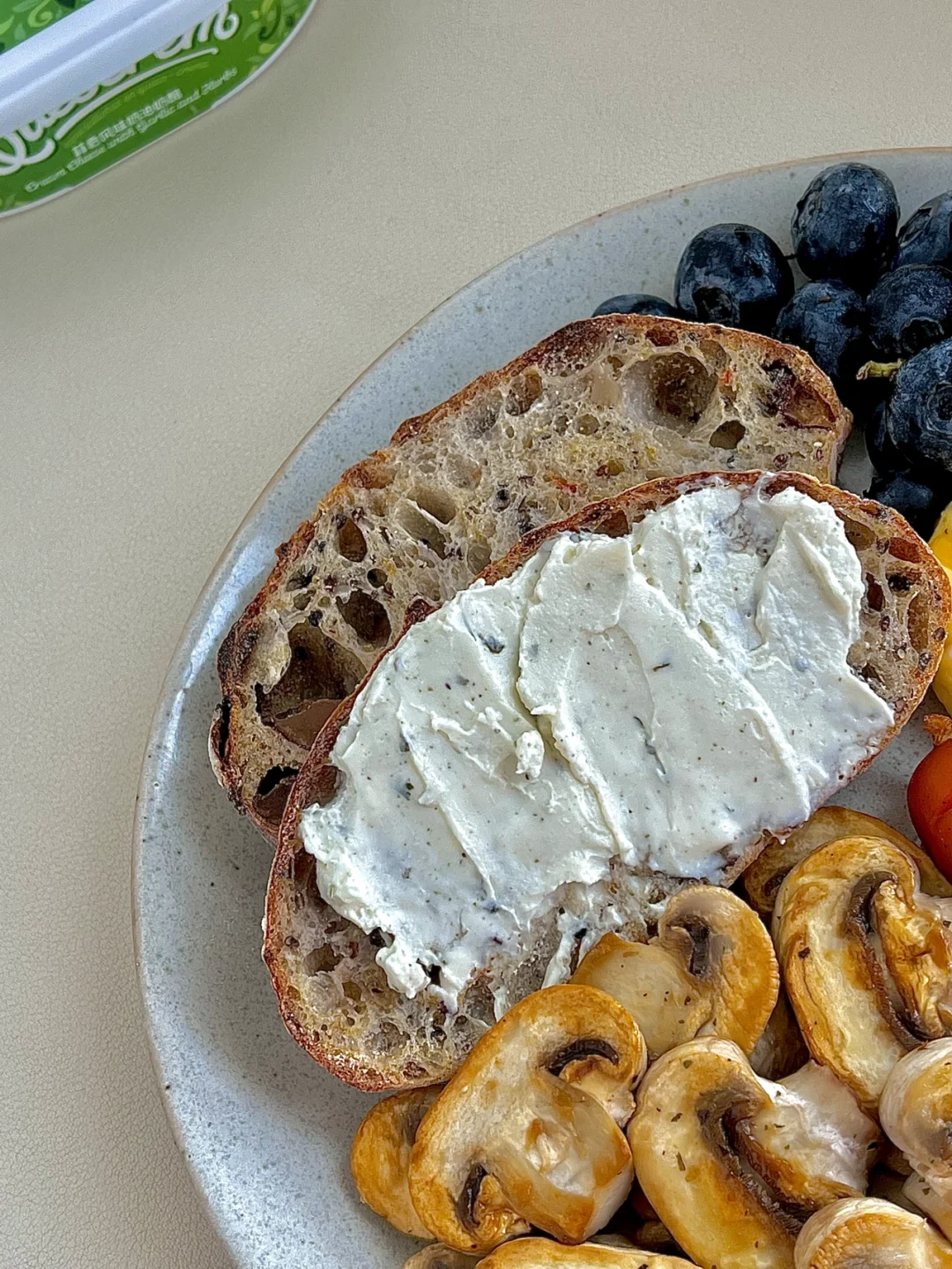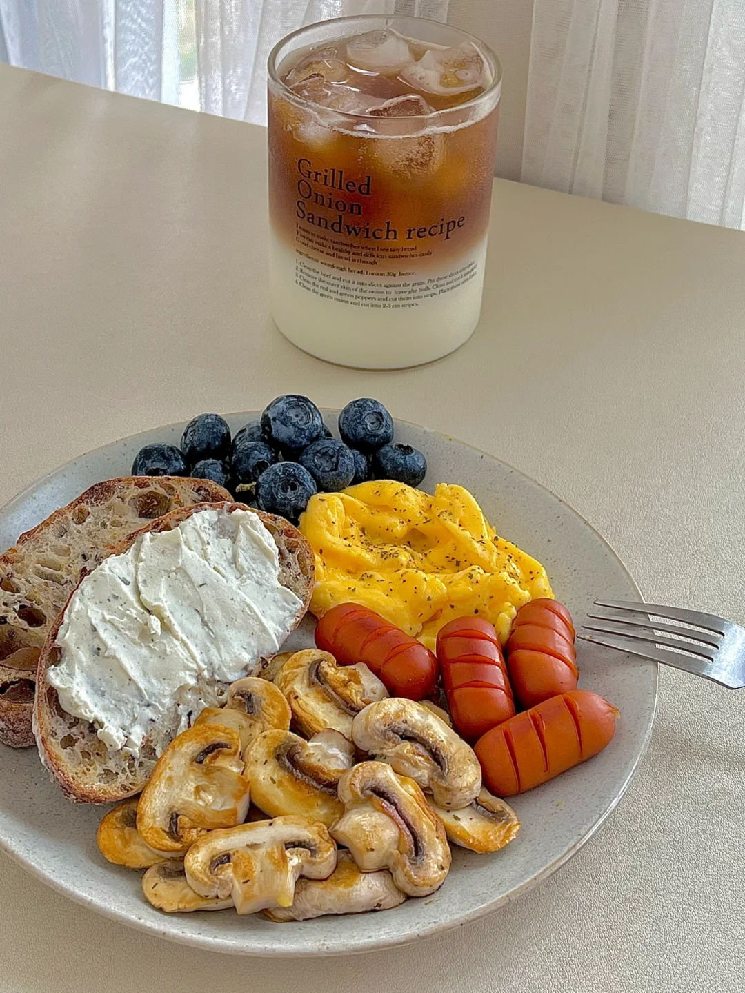 今日份早餐分享:藜麦红枣硬欧搭配蒜香奶酪|牛奶滑蛋|黄油煎口蘑|烤脆皮小香肠|蓝莓|一杯冰拿铁☕️。 . 我太喜欢这个藜麦红枣的硬欧了,复烤之后很香再搭配蒜香奶酪绝了。今天的口蘑很新鲜所以煎出来就很好看,大小也合适。 . 昨天晚上格外凉快,竟然没开空调睡的也很好,真的希望天天都是这样凉爽舒适的感觉。