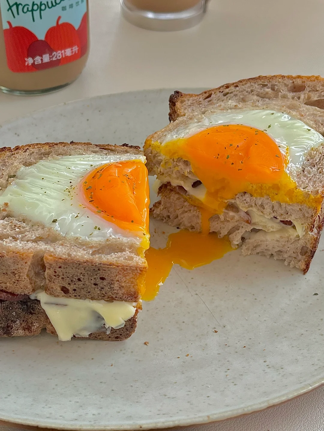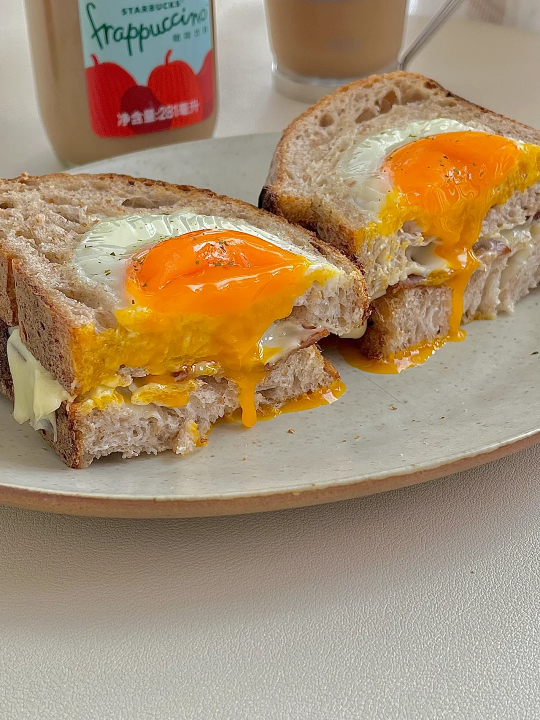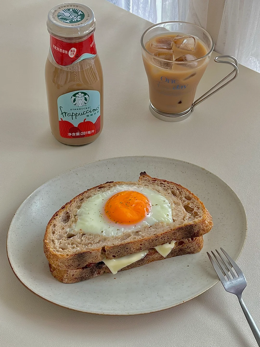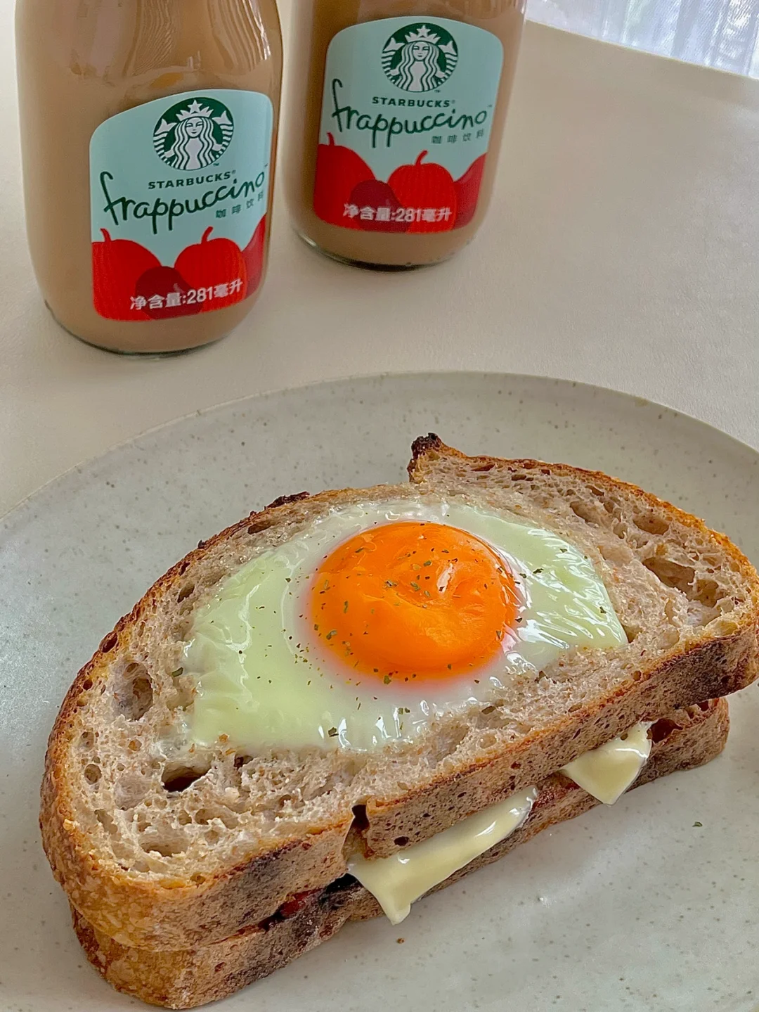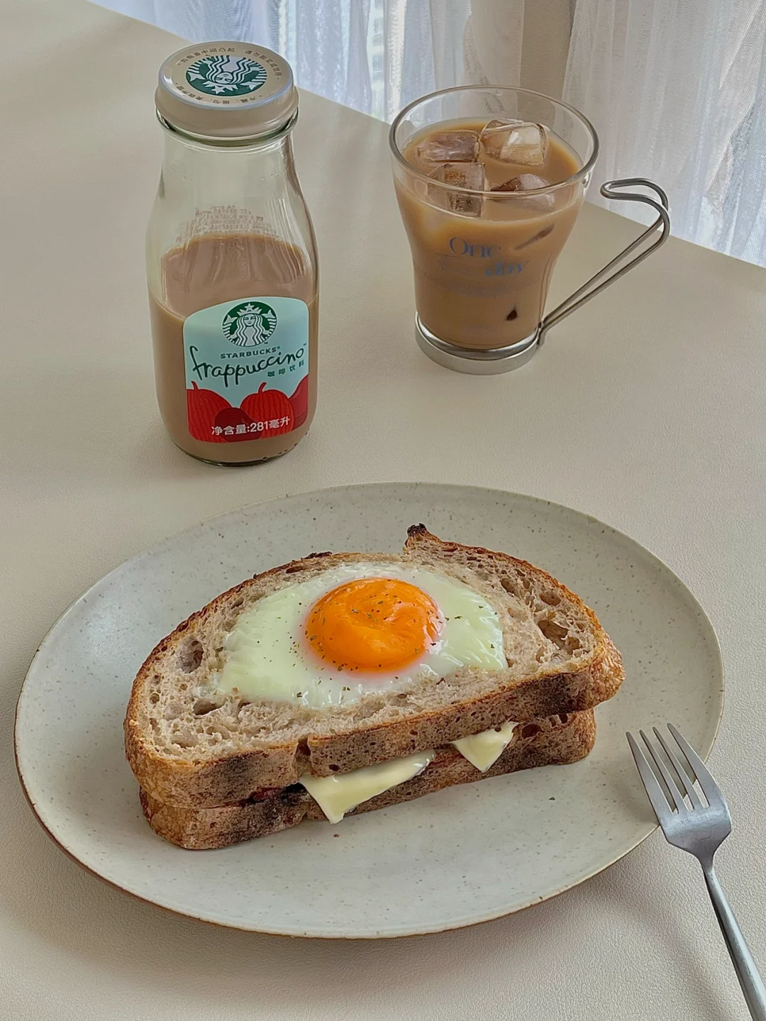 ️今日份治愈早餐—太阳蛋三明治搭配瓶装星巴克,真的是简单又好吃😋
