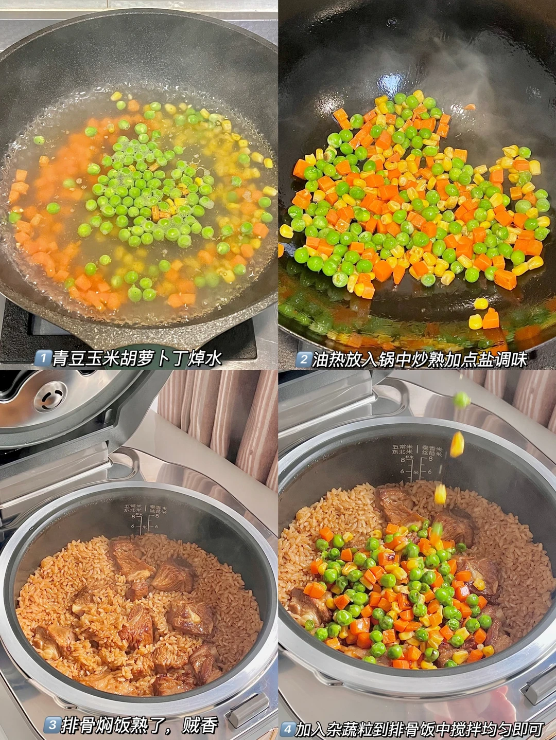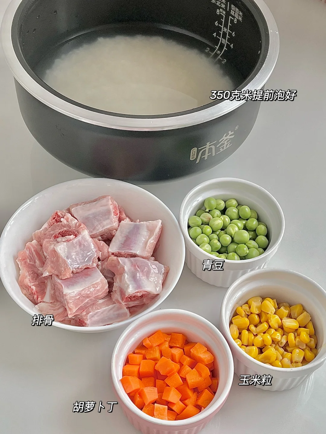 🍲食材:排骨10块,大米300克,青豆 胡萝卜 玉米粒适量。