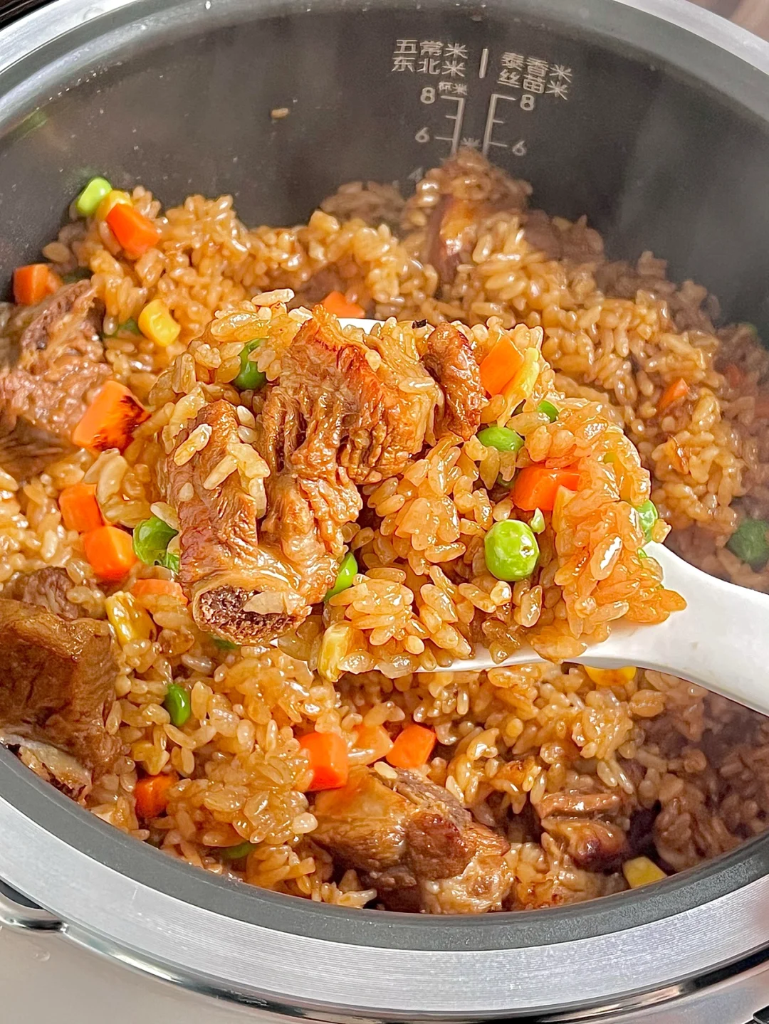 6️⃣把汤汁和排骨倒进米中,平时做饭水即可。