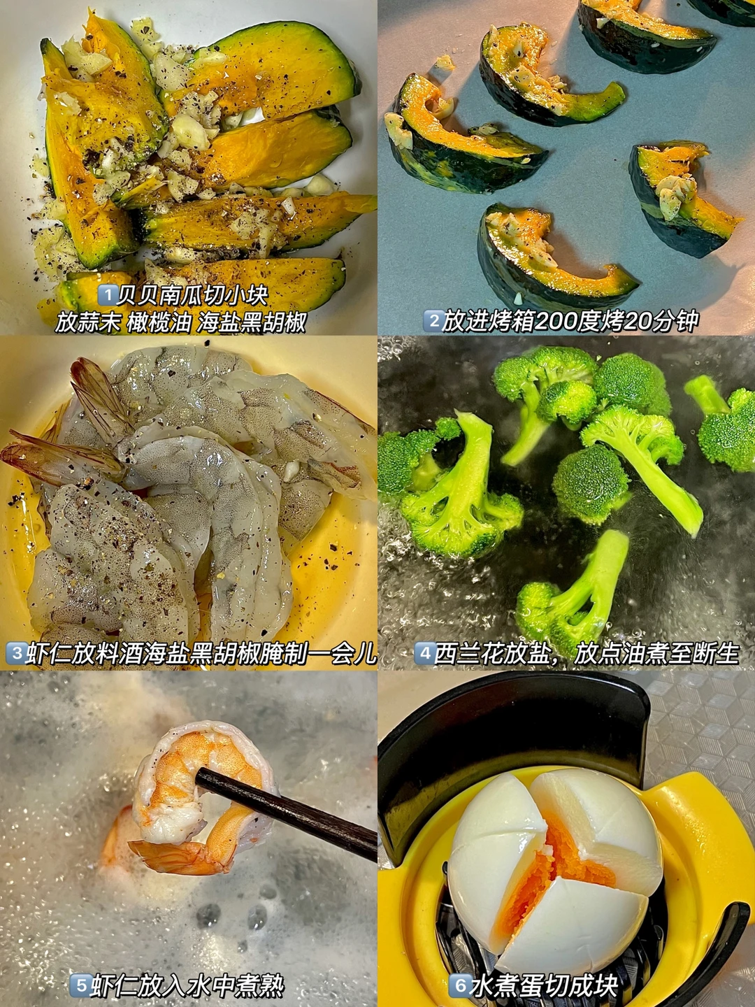 热气腾腾的三餐 今日份早餐分享: 烤南瓜虾仁鸡蛋沙拉🥗 一杯美式☕️ . 1️⃣贝贝南瓜切小块,放蒜末 橄榄油 海盐黑胡椒。 2️⃣放入烤箱200度烤20分钟。根据自家烤箱温度来 3️⃣虾仁放料酒海盐黑胡椒腌制一会儿。 4️⃣水开放入虾仁煮熟。 5️⃣另烧水放盐和一点油把西兰花煮至断生。 6️⃣再煮一个水煮蛋,切开。 7️⃣随意的摆在盘子里就可以了。 . 烤南瓜好好吃😋你们也试试