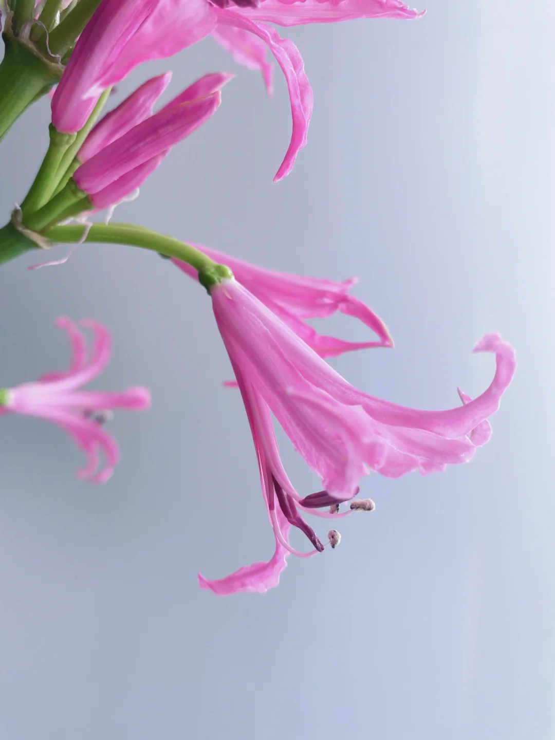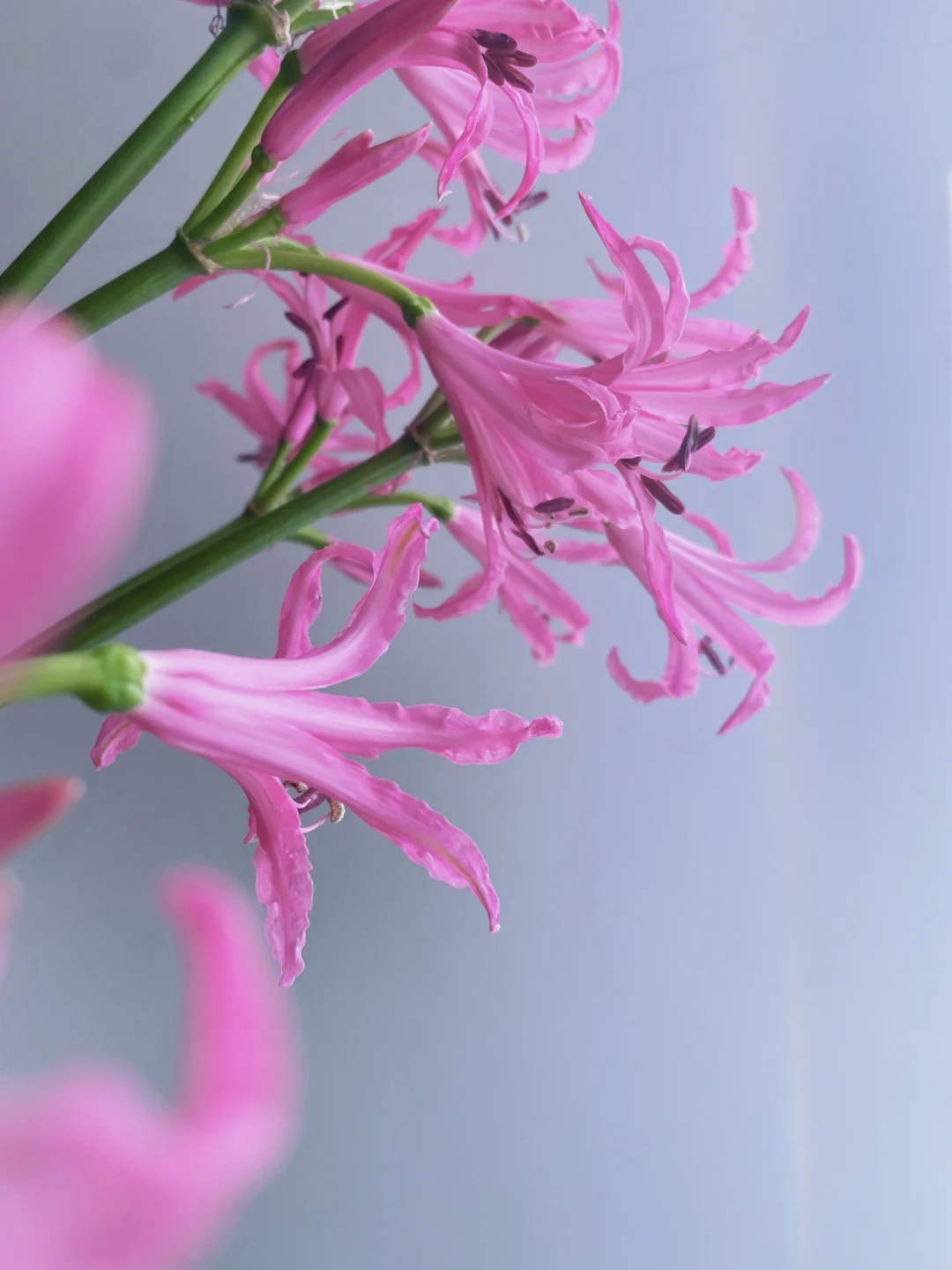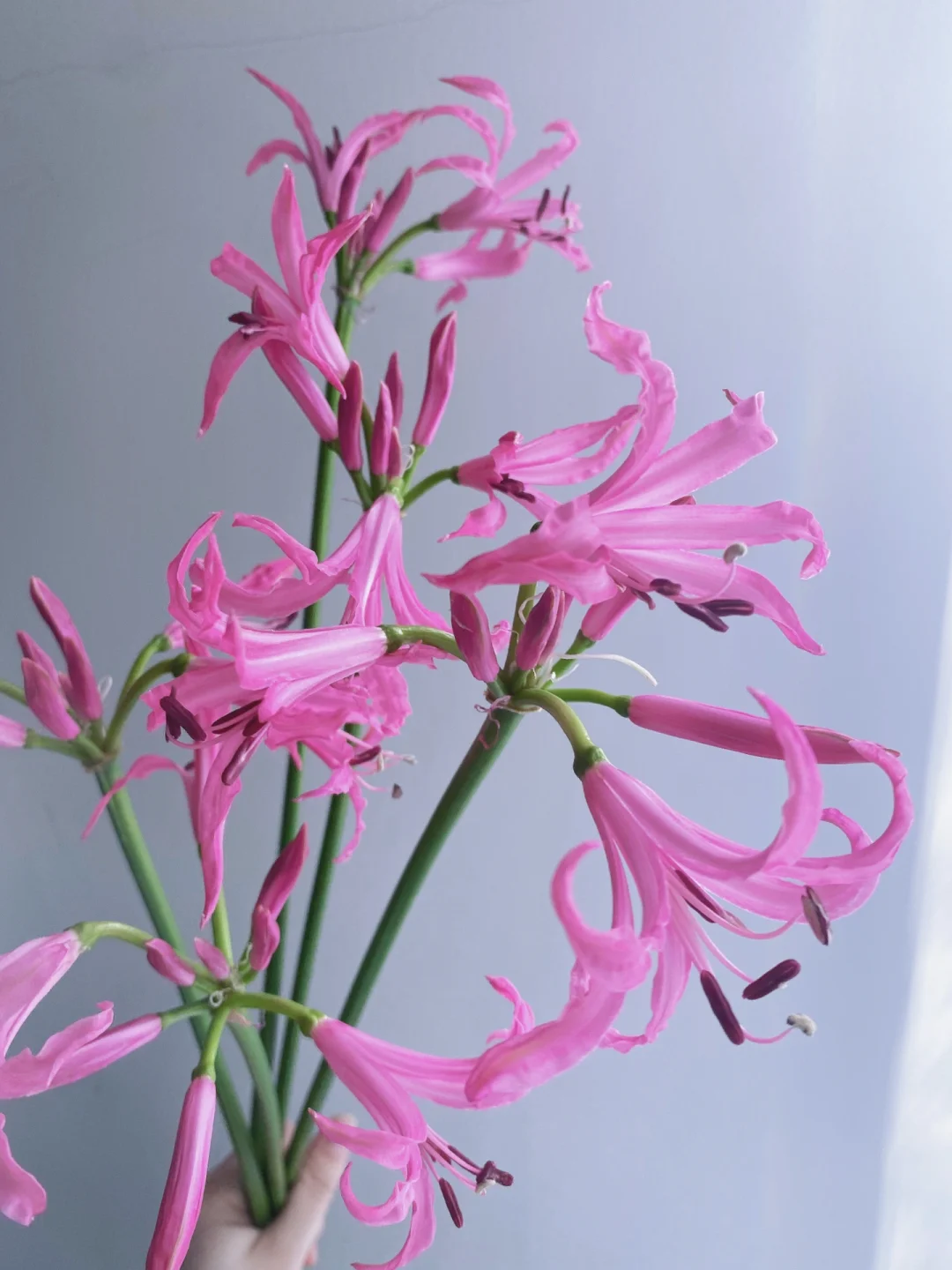荷兰进口的玫红色石蒜,到手时还是小巧的花苞,会3个花苞一组慢慢的开放,直到所有花苞完美盛放,像慢慢炸开的烟花,自带小小的卷曲感,非常精致。石蒜很早就因为“花叶永不相见”而蒙上了一层神秘的面纱,但也正因如此,石蒜变得广为人知,花型纤细优美,枝干颀长,灵动舒展,是不可多得的美丽存在。