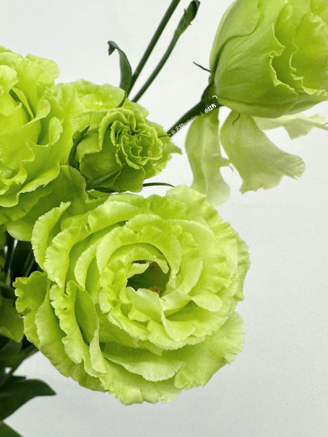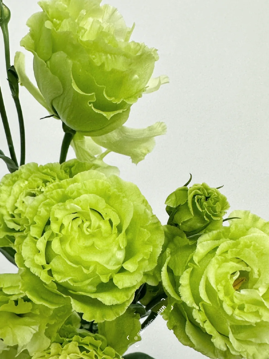 花材:翠绿洋桔梗 花语:富于感情,感动,不变的爱只给你 花期:夏季10天左右 冬季20天左右 养护(洋桔梗很容易折断,不要大量堆积在一个容器内) 1️⃣换水:夏季每日一次,水中加营养液或消毒剂 2️⃣清洗:花瓶清洗干净,擦掉水渍,花杆剪根冲洗 3️⃣水位:花瓶高度1/2 4️⃣修剪:根部以上2~3cm处45°斜剪(增大吸水面积) 🌈|TIPS|长按自取|感谢喜欢|欢迎分享