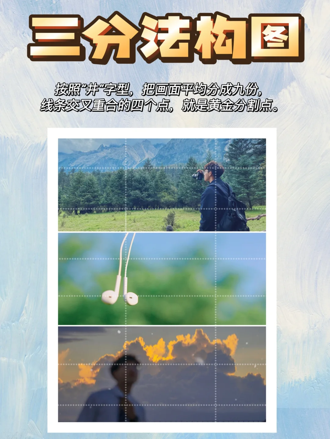 把画面平分成九份,其中交叉点重合的四个点就是黄金分割点。应用广泛,适合风景人物等。