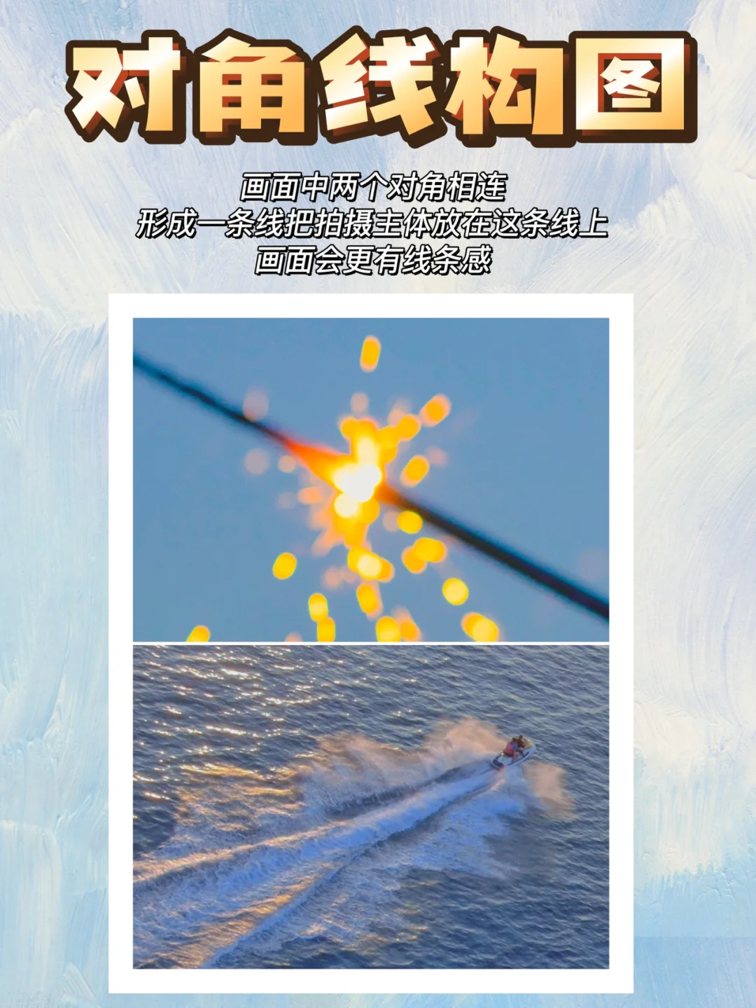 是一种很灵活的构图方式,海边游艇划出一条浪花占满画面的对角线,和仙女棒与画面的对角线重合,也是一个不错的构图方式。对角线构图使画面显得更有冲击感和线条感。
