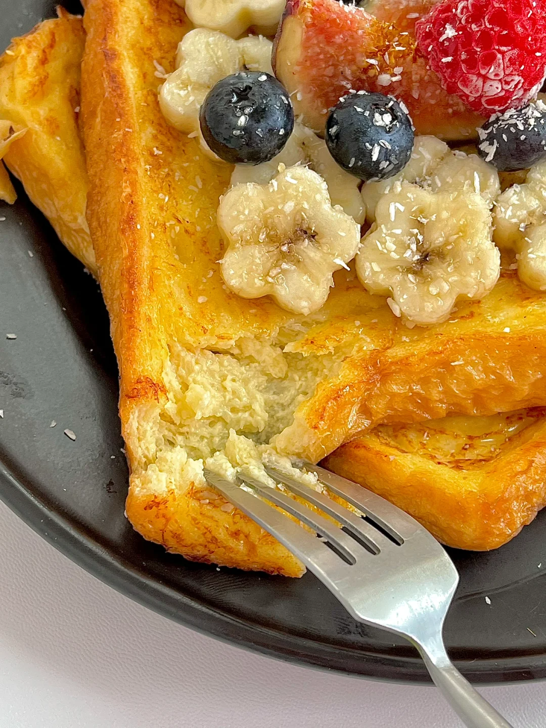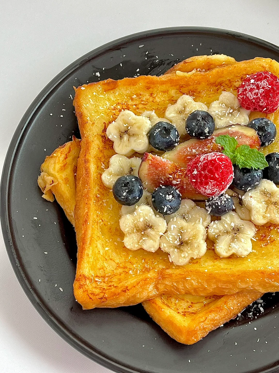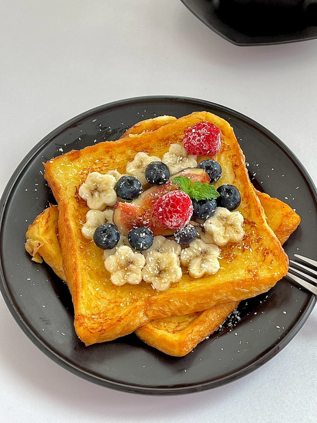 今日份早餐分享: 水果法式吐司🍞 一杯拿铁☕️ . 🍞食材:吐司两片 牛奶200毫升 两个鸡蛋 水果 🍞做法: 1️⃣鸡蛋加入牛奶搅拌均匀。 2️⃣吐司放进去浸泡,让两边都浸泡透。 3️⃣锅中放入黄油,融化后放吐司两边煎至金黄即可 4️⃣煎好摆上喜欢的水果,撒点蜂蜜和椰蓉。 . 法吐是经常吃都不会腻的吐司做法,真的真的好好吃😋工作日了,祝大家有个好心情呀!