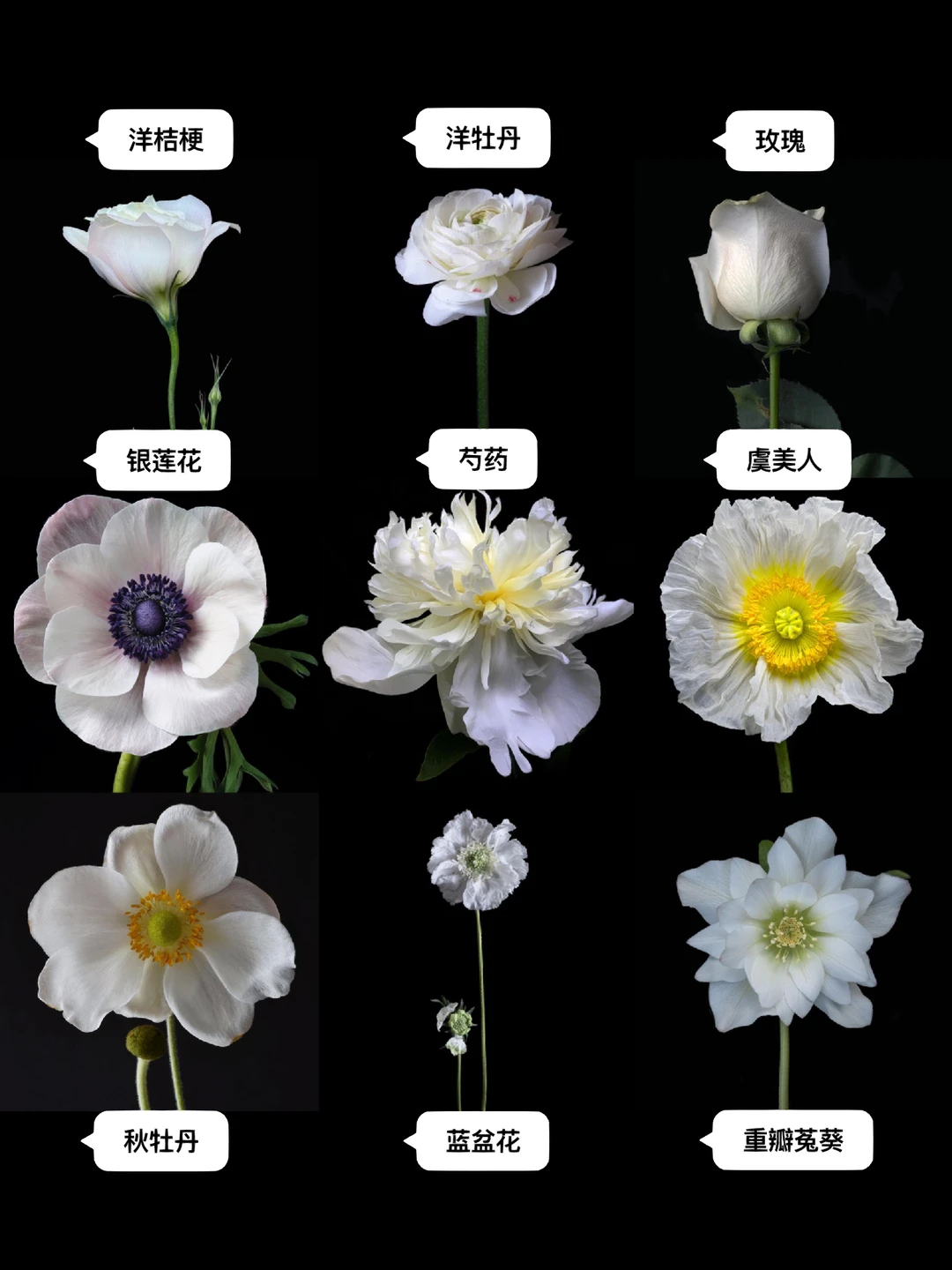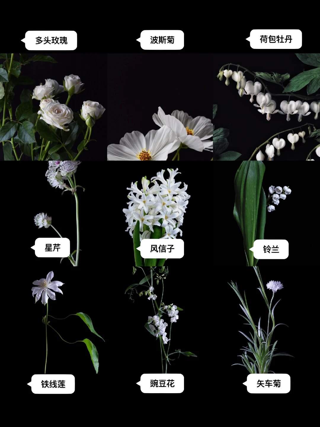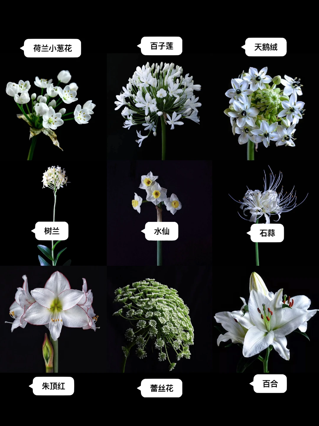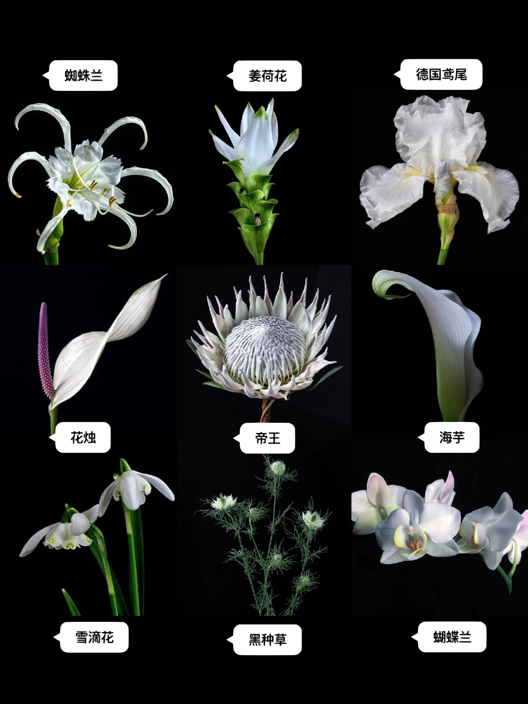 图1️⃣ 洋桔梗、洋牡丹、白玫瑰 银莲花、芍药、虞美人 秋牡丹、蓝盆花、重瓣菟葵 图2️⃣ 蜘蛛兰(也叫“水鬼蕉”)、姜荷花、德国鸢尾 花烛、帝王花、海芋 雪滴花、黑种草、蝴蝶兰 图3️⃣ 荷兰小葱花、百子莲、天鹅绒 树兰、水仙、石蒜 朱顶红、蕾丝花、百合 图4️⃣ 络新妇、珍珠菜、瓶子草 大花惠兰、大飞燕、葡萄风信子 晚香玉、雪片莲、鹦鹉郁金香 图5️⃣ 多头玫瑰、波斯菊、荷包牡丹 星芹、风信子、铃兰 铁线莲、豌豆花、矢车菊