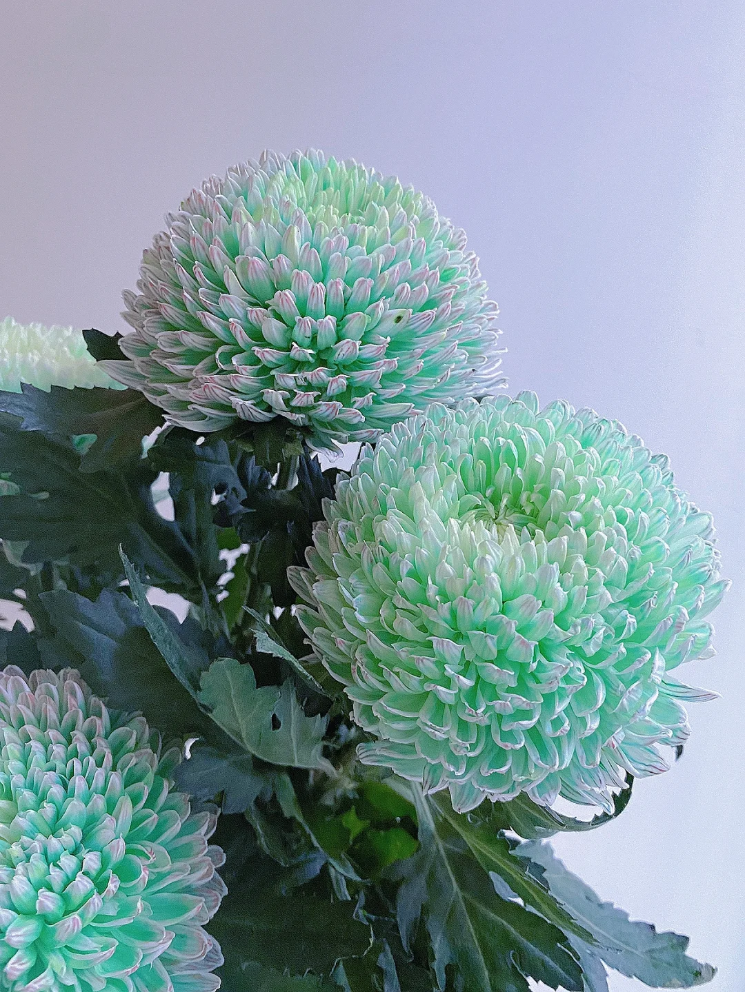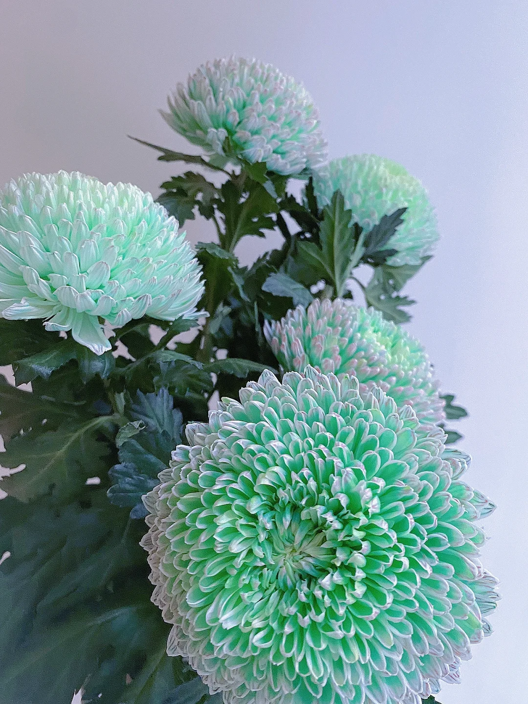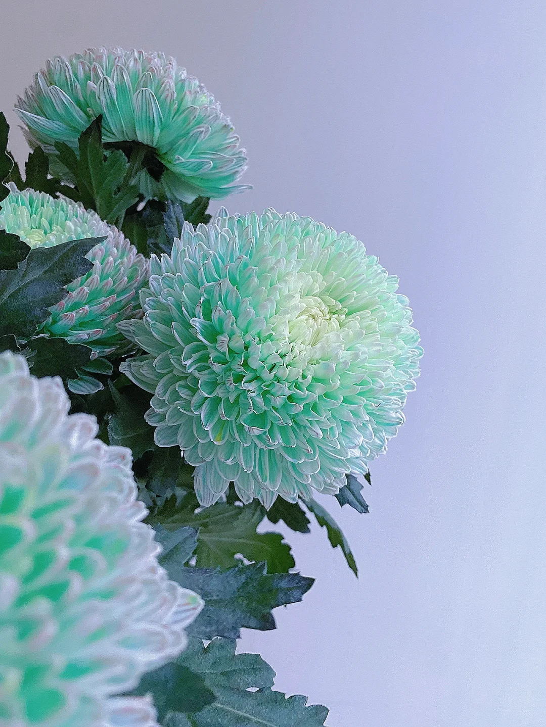 ⚪️🟢搭配:它的单独出现就足以惊艳,常在作品当中作为焦点花使用,搭配其他的碎花也可烘托出它的雍容华贵。颜色多样,市面上吸染的颜色丰富多样,可适配各种色彩的花束,同时因为其华丽的气质,也经常使用在年宵花当中。
