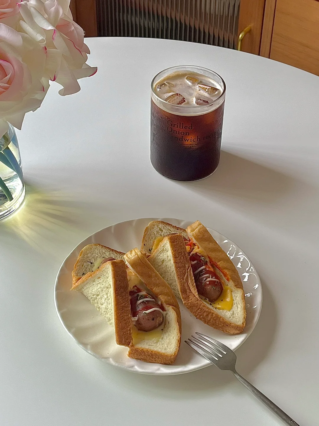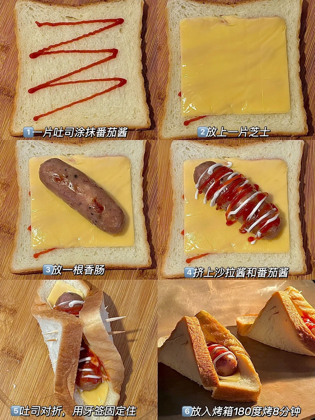 一人食吃什么 今日份早餐分享: 芝士香肠吐司卷 一杯冰美式☕️ . 1️⃣一片吐司上涂抹番茄酱。 2️⃣放上一片芝士,放入一根烤肠(烤肠提前烤下) 3️⃣挤上番茄酱和沙拉酱。 4️⃣吐司对折,中间用牙签固定住。 5️⃣放入烤箱,180度烤8分钟。 . 馋了好久的芝士香肠吐司卷,家里正好有吐司赶紧安排上,真的好好吃😋,做法简单,适合懒人😂