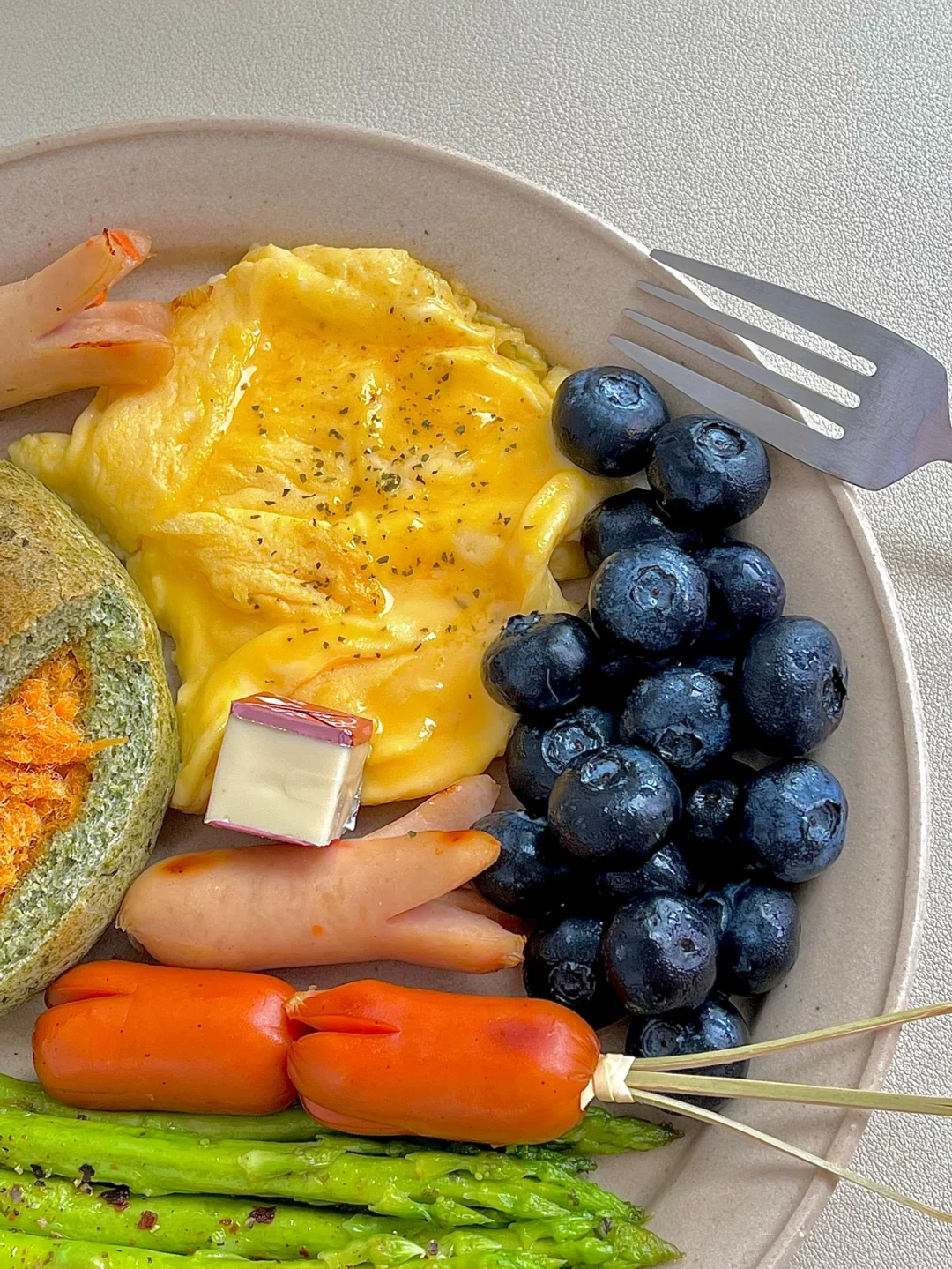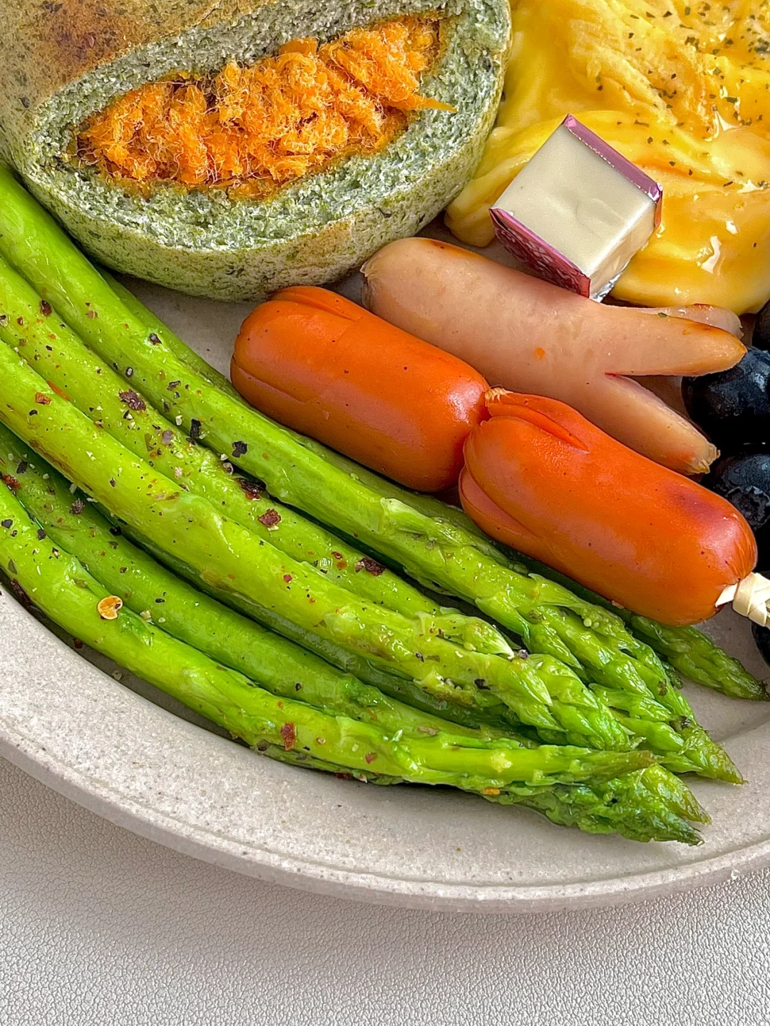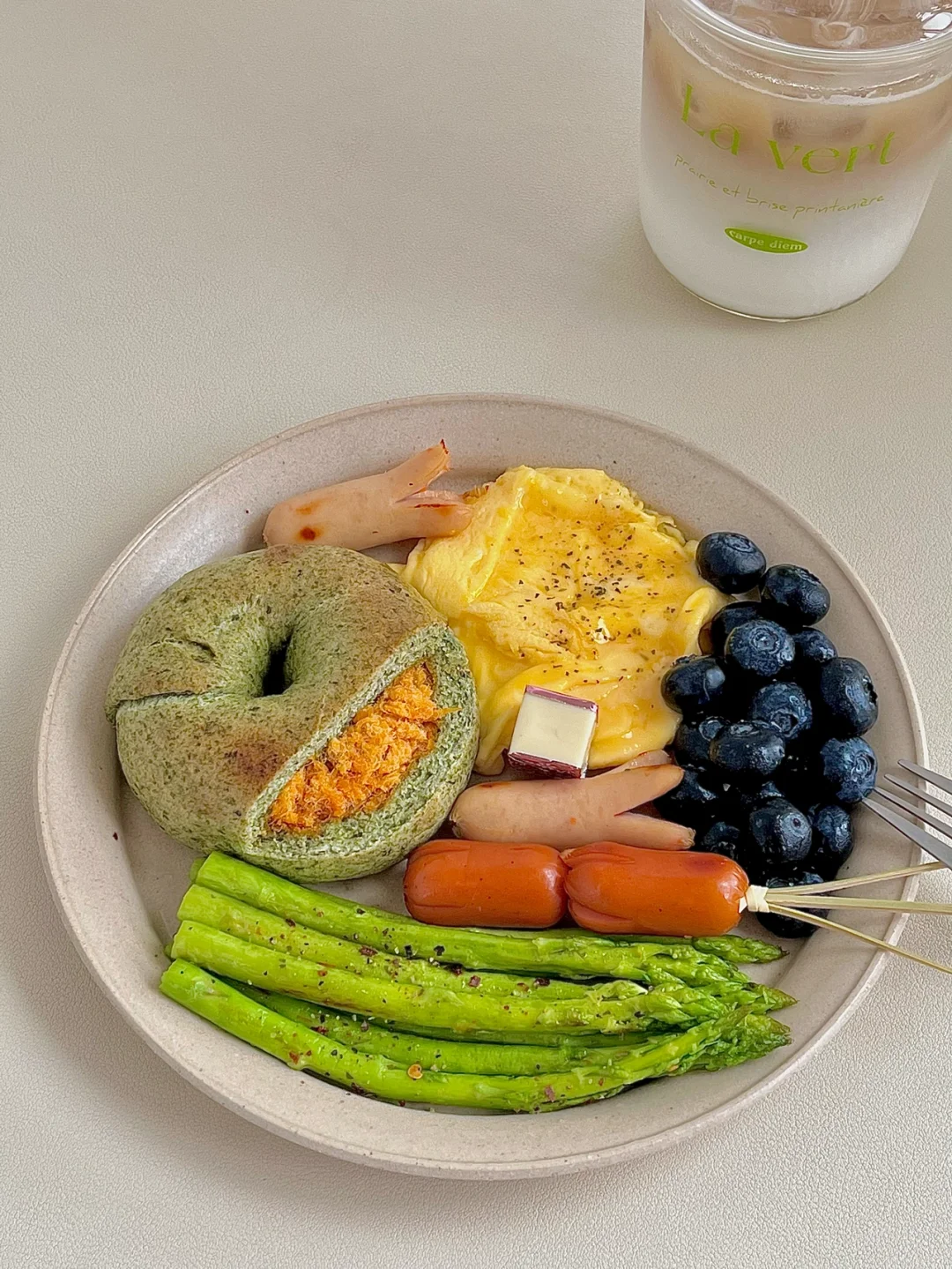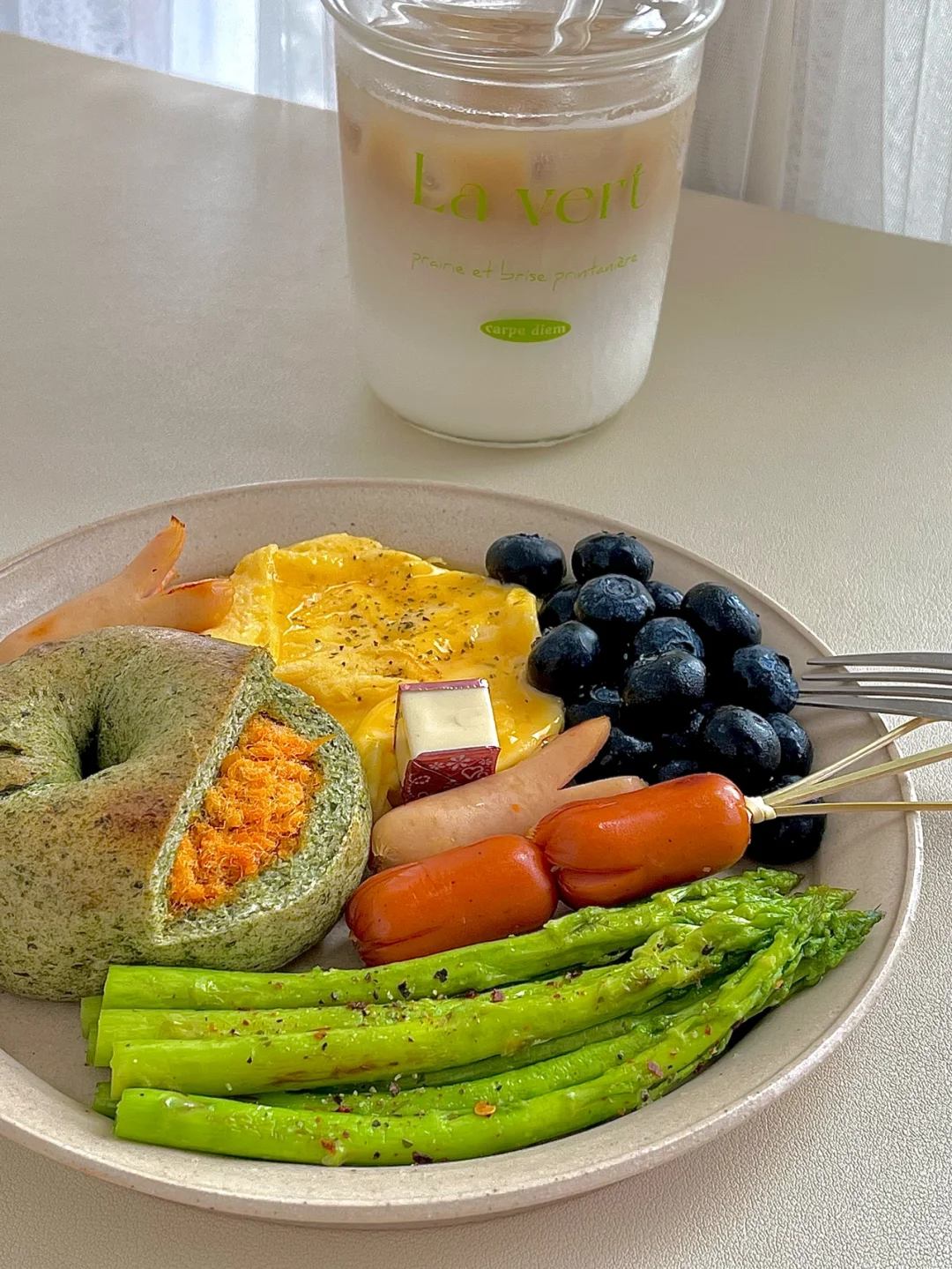 今日份早餐:料足的海苔肉松贝果|牛奶滑蛋|煎芦笋|蓝莓|脆皮肠和胡萝卜鸡肉肠|一杯冰拿铁☕️ . 工作日的简单早餐盘,海苔肉松贝果,原来以为肉松是海苔肉松,没想到是面包体是海苔夹心的,有点特别哦!口感很扎实用料也足,这饱腹感杠杠的😋 . 祝大家新周快乐,这天气真的越来越热,大早上起来的太阳就特别晒,一定要注意防暑哦!