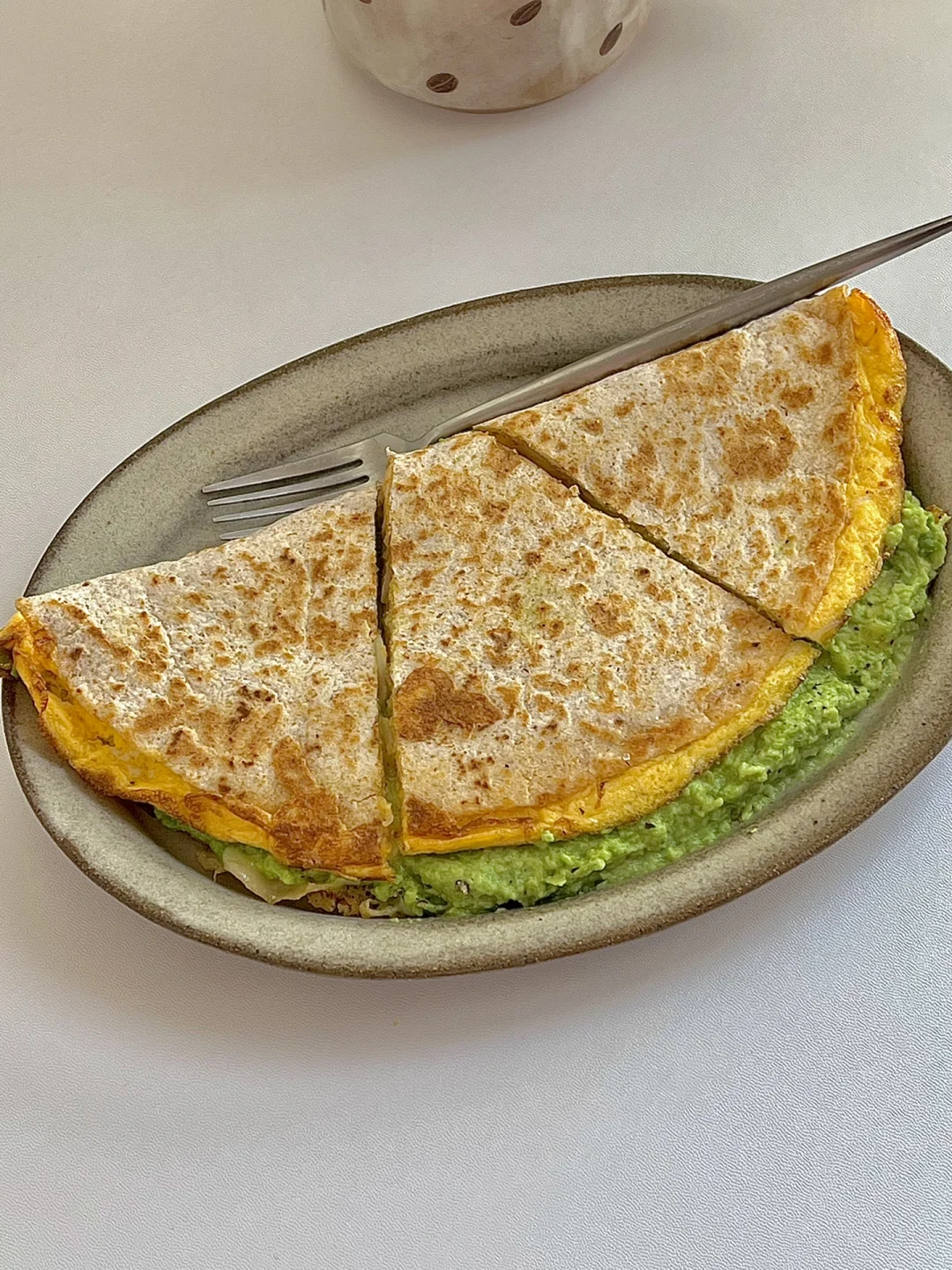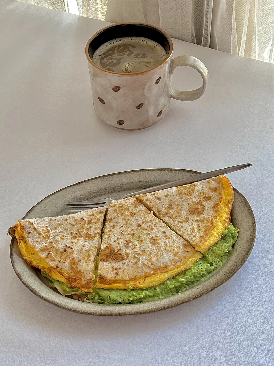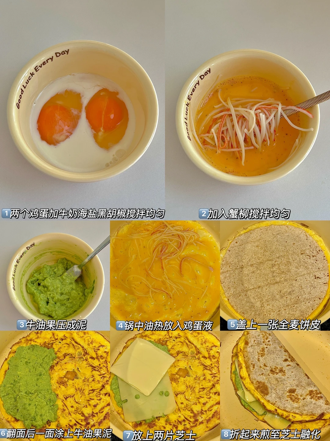 热气腾腾的三餐 今日份早餐分享: 牛油果芝士蟹柳滑蛋卷饼 一杯拿铁☕️ . 🫔食材:全麦饼皮一张 牛油果半个 鸡蛋两个 牛奶适量 蟹柳 芝士两片 🫔做法: 1️⃣鸡蛋加牛奶海盐黑胡椒搅拌均匀。 2️⃣加入蟹柳搅拌均匀。牛油果加黑胡椒压成泥。 3️⃣锅中油热把鸡蛋液倒进锅中,小火煎制定型。 4️⃣蛋液没凝固前盖上全麦饼皮,然后翻面。 5️⃣一面放上牛油果泥,放上两片芝士。 6️⃣饼皮对折煎至芝士片微微融化即可。 . 年后都来吃它,饱腹感十足,味道杠杠的😋