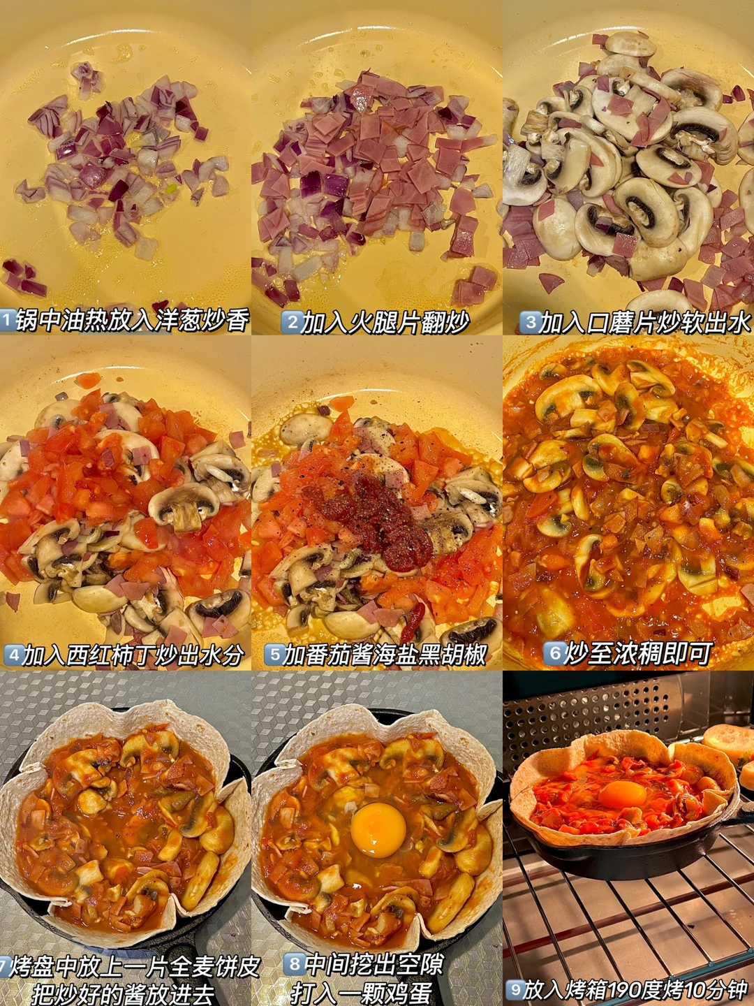 ✨食材:口蘑六个 西红柿一个 洋葱适量 火腿片两片 鸡蛋一个 全麦饼皮一张 番茄酱适量