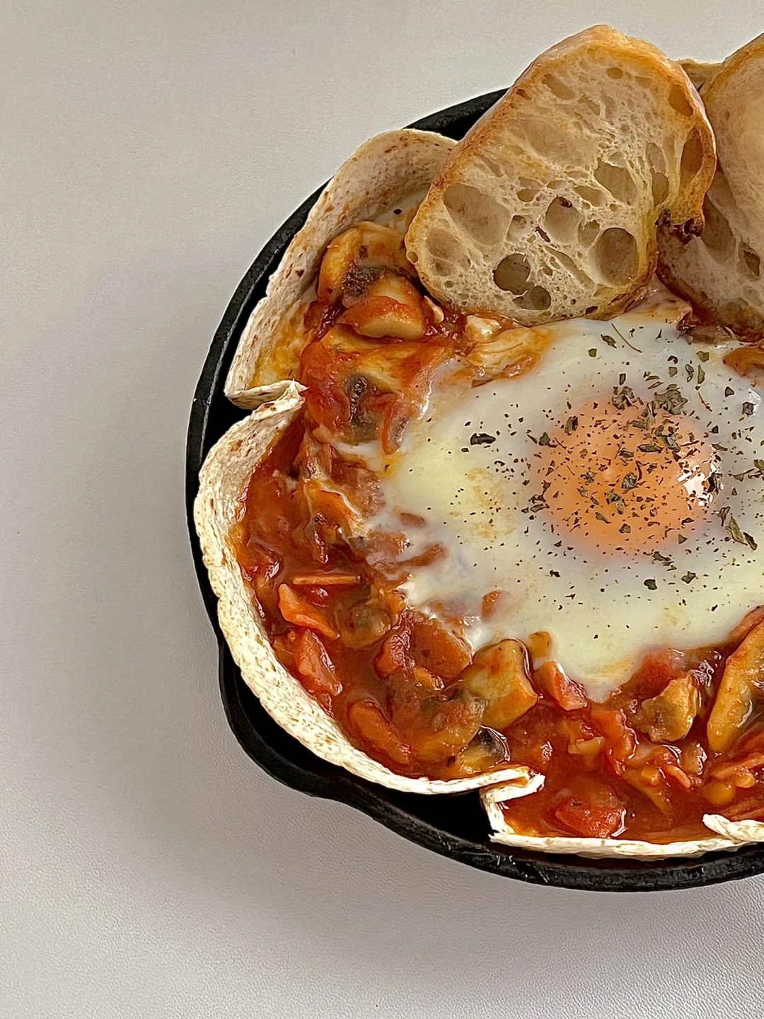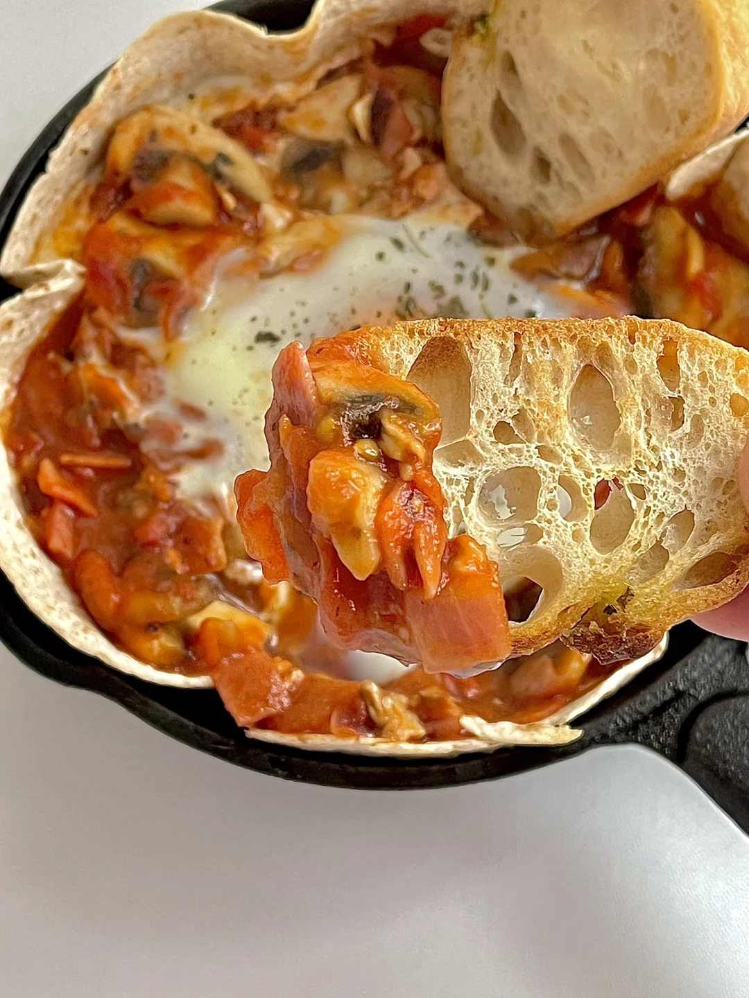 4️⃣烤碗中放上一张全麦饼皮,把炒好的酱料盛进碗中,中间弄个坑,把鸡蛋打进去。