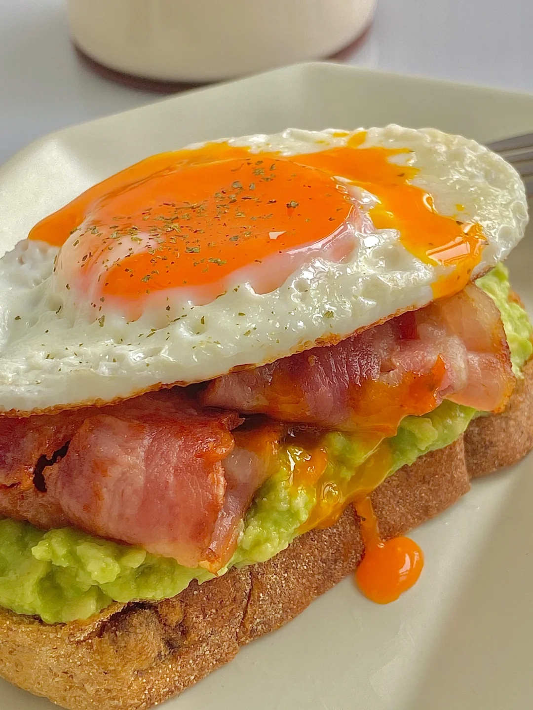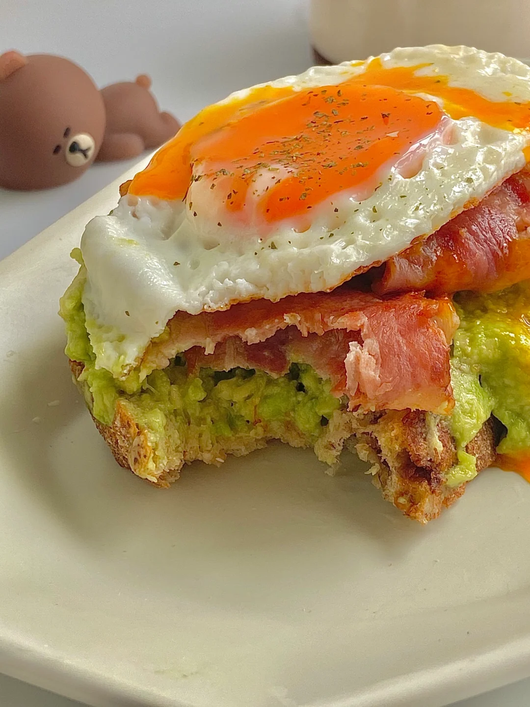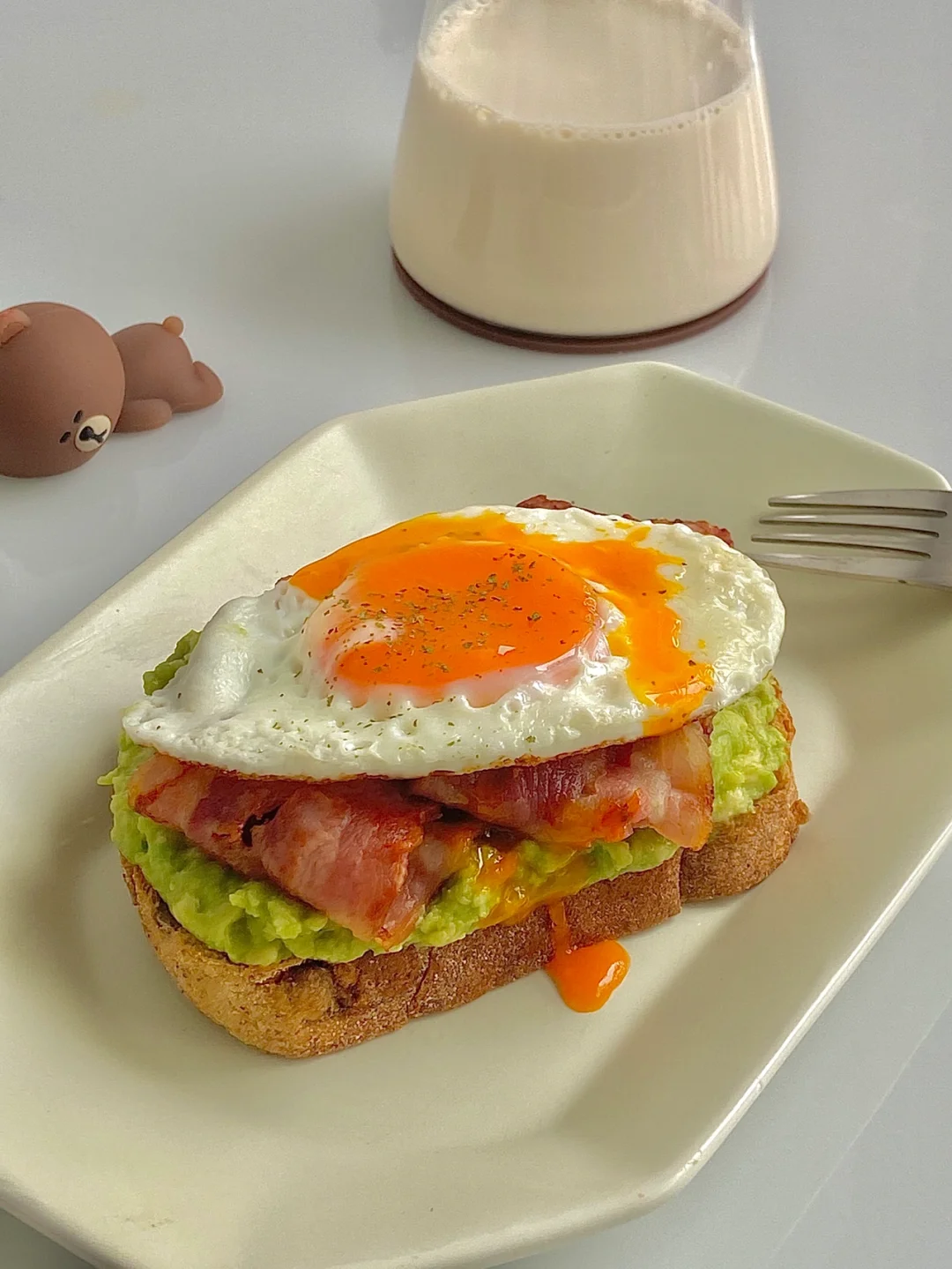 今日份早餐:硬欧开放式三明治(牛油果泥 两片培根 一个煎蛋)一杯燕麦拿铁☕️ . 今早上起晚了,只能来个五分钟系列早餐,复烤硬欧的时候煎鸡蛋和培根,顺便再把牛油果压成泥,最后组装在一起,今日份快手早餐完成✅ . 终于要到周末了,开心🥳