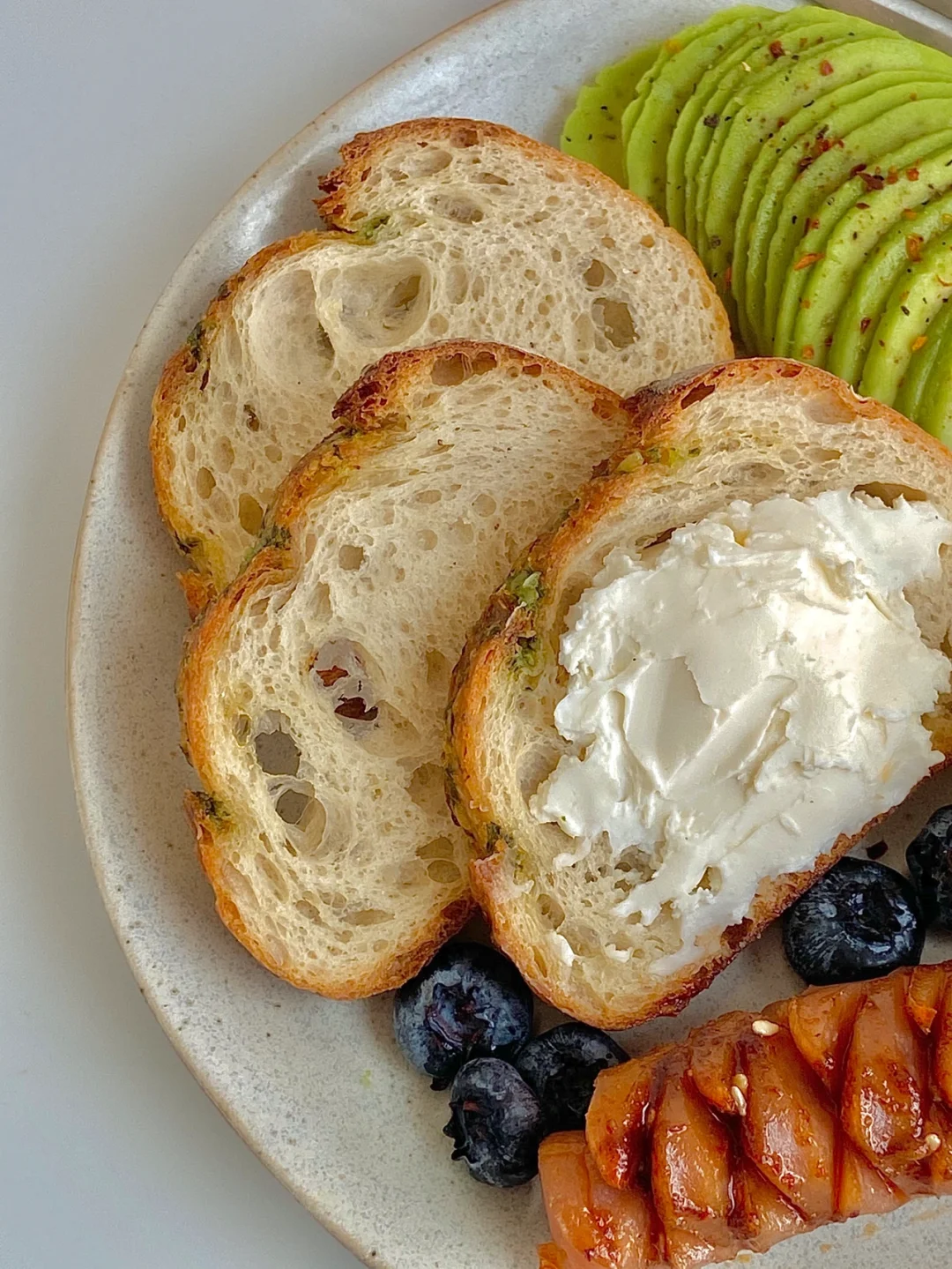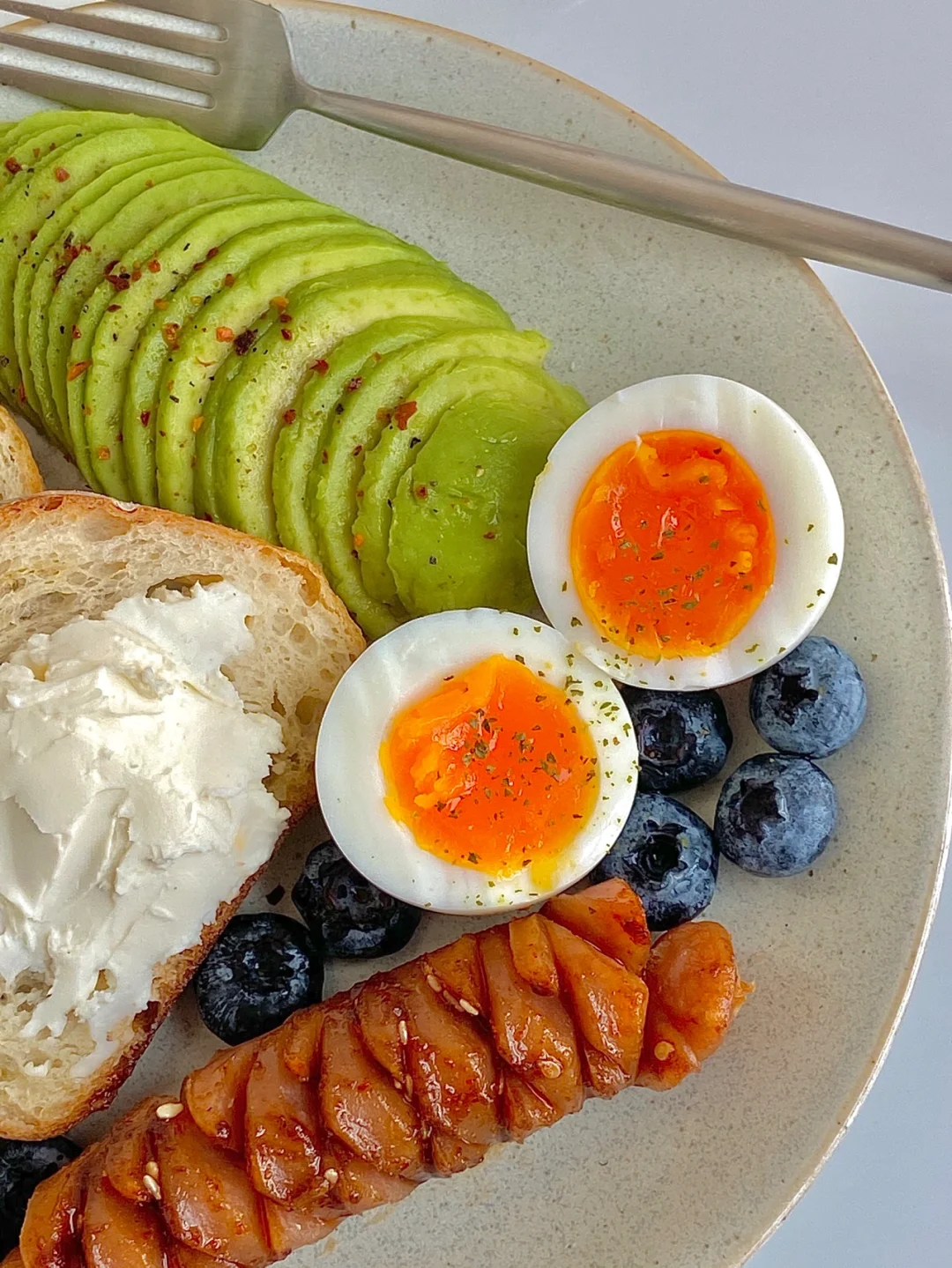 今日份早餐:蒜香法棍🥖,牛油果🥑,水煮蛋🥚,蓝莓,香辣烤香肠,一杯冰拿铁☕️ . 好多天没喝冰的了,今天有点降温了可我还是忍不住想喝冰的,喝完好舒服😌。今天是简单的一盘端,复烤法棍超级香,牛油果这次买的又不好😭,烤香肠出炉后我刷了一层昨天烤烧烤剩下的香辣酱😋 . 假期最后两天,好好享受吧宝宝们😘