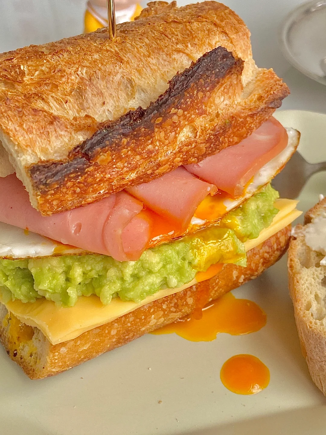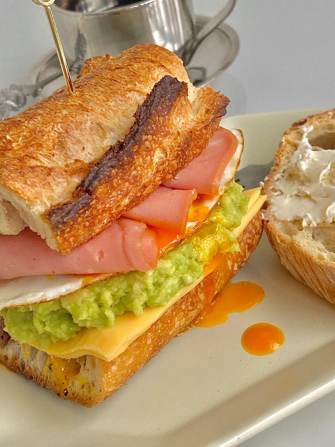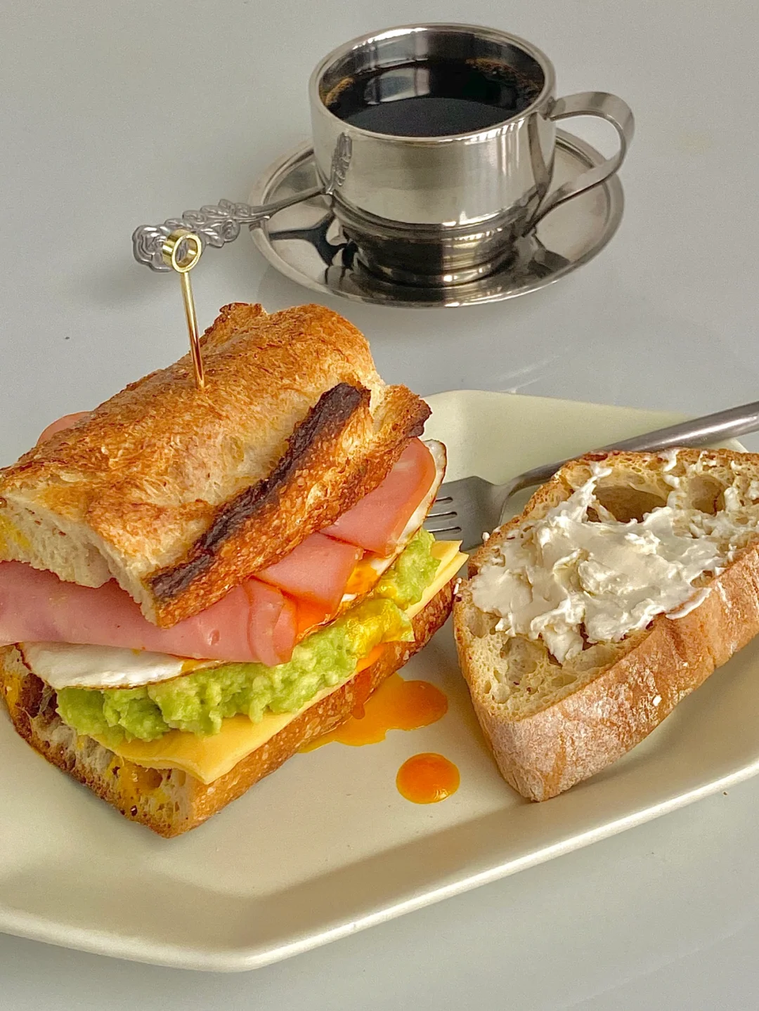 今日份早餐:法棍三明治(芝士片 牛油果泥 煎蛋 火腿片)一片奶酪恰巴塔,一杯热美式 . 复烤了法棍后感觉自己吃不饱,又加了一块恰巴塔[笑哭R]最近感觉食欲特好,可能是天气转冷的原因,我这胃口也是没谁了。复烤过的法棍真的是太香了,嘎嘣脆,就爱这口感,还好我牙口比较好😏