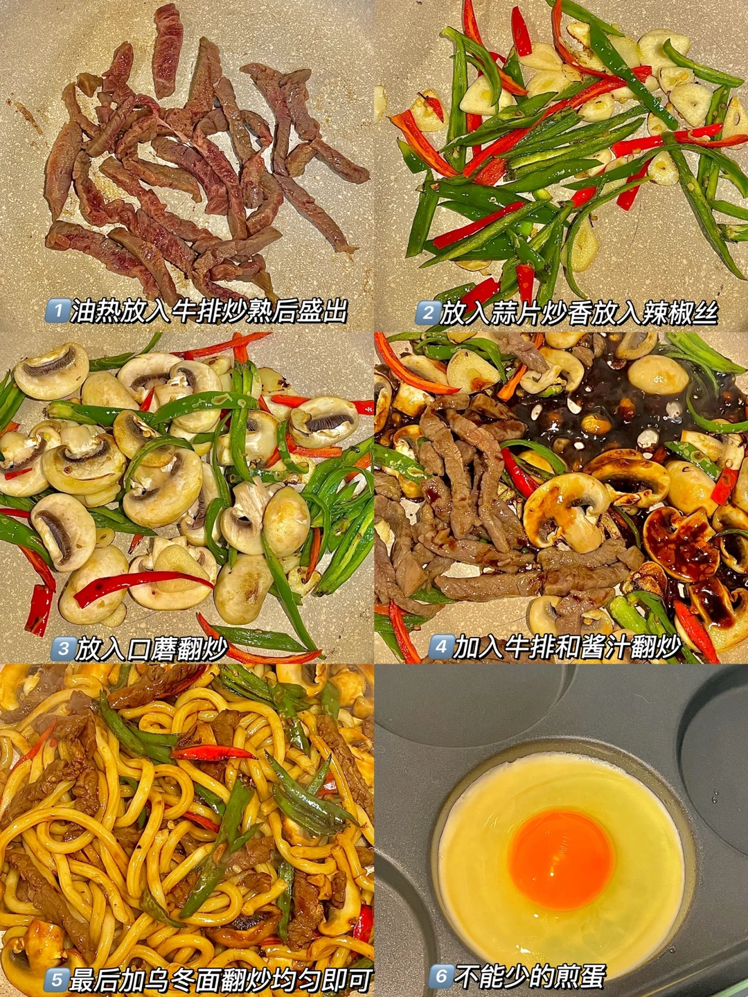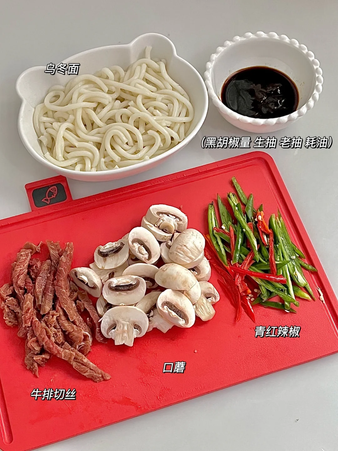 🥢材料:一包乌冬面,牛肉(我用的是半块牛排)口蘑,青红辣椒,酱汁(黑胡椒酱,生抽,老抽,蚝油)这个量根据自己的口味来调