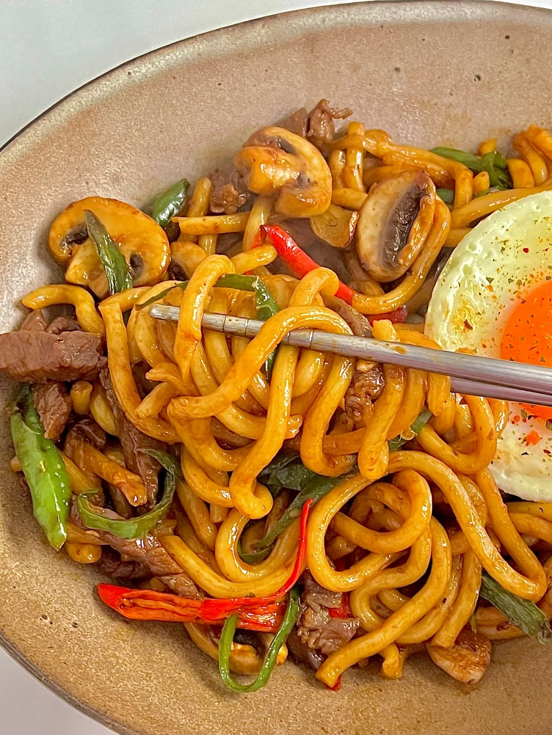 4️⃣最后把乌冬面放入锅中翻炒均匀即可。(乌冬面提前煮一下)