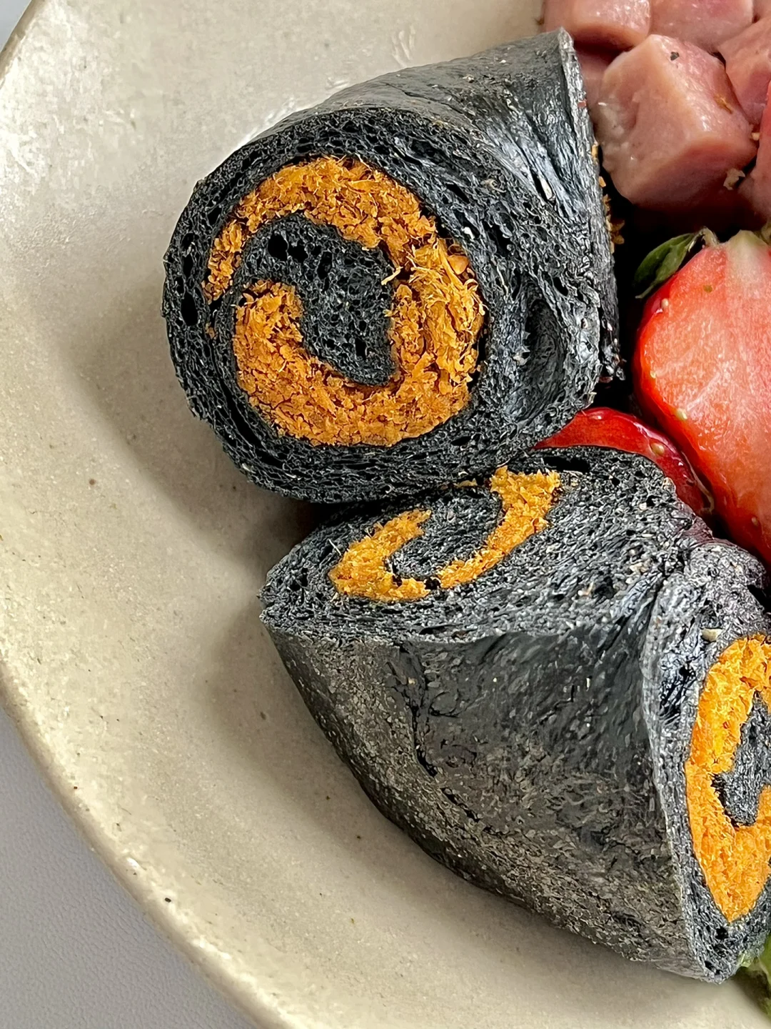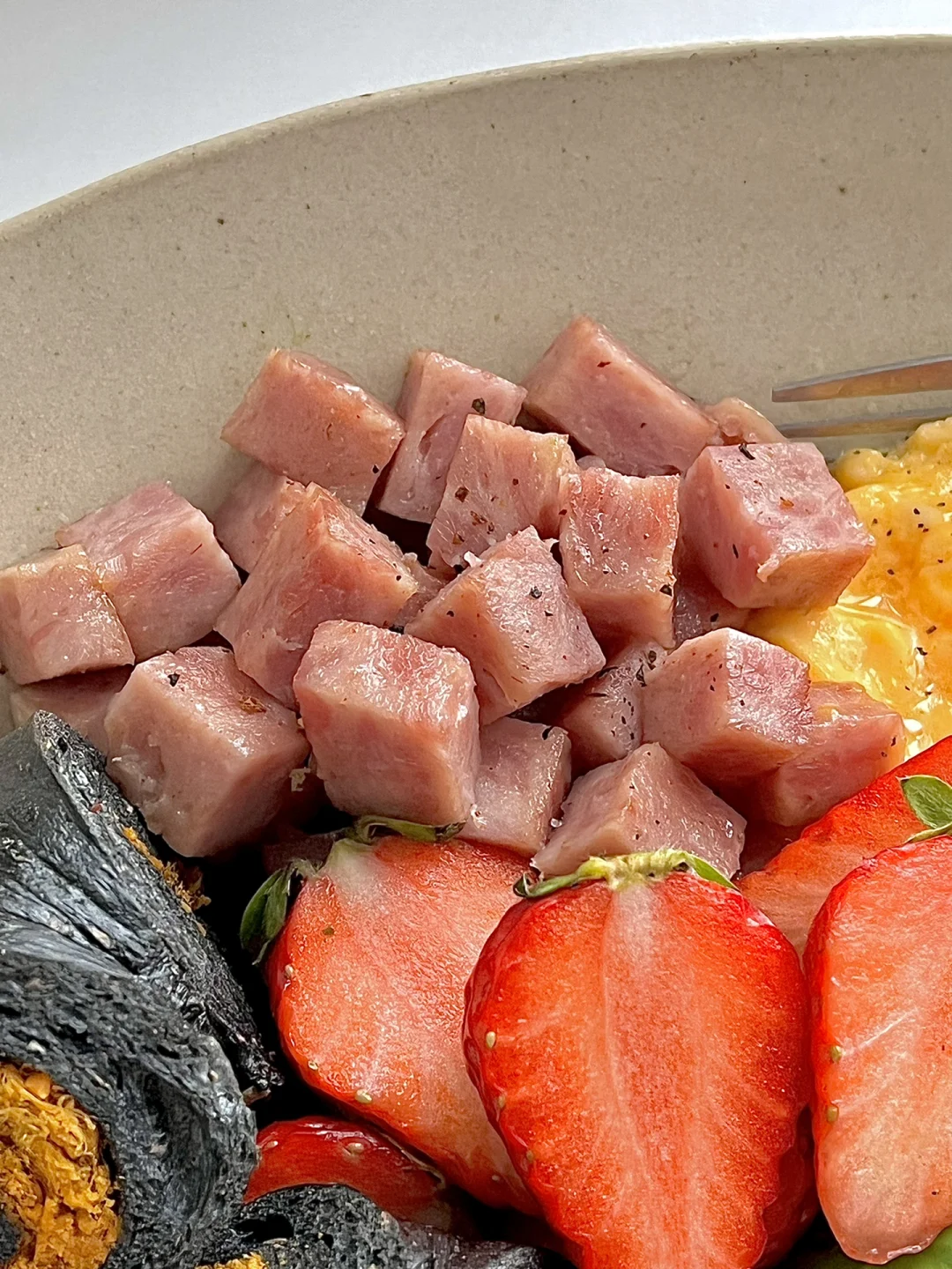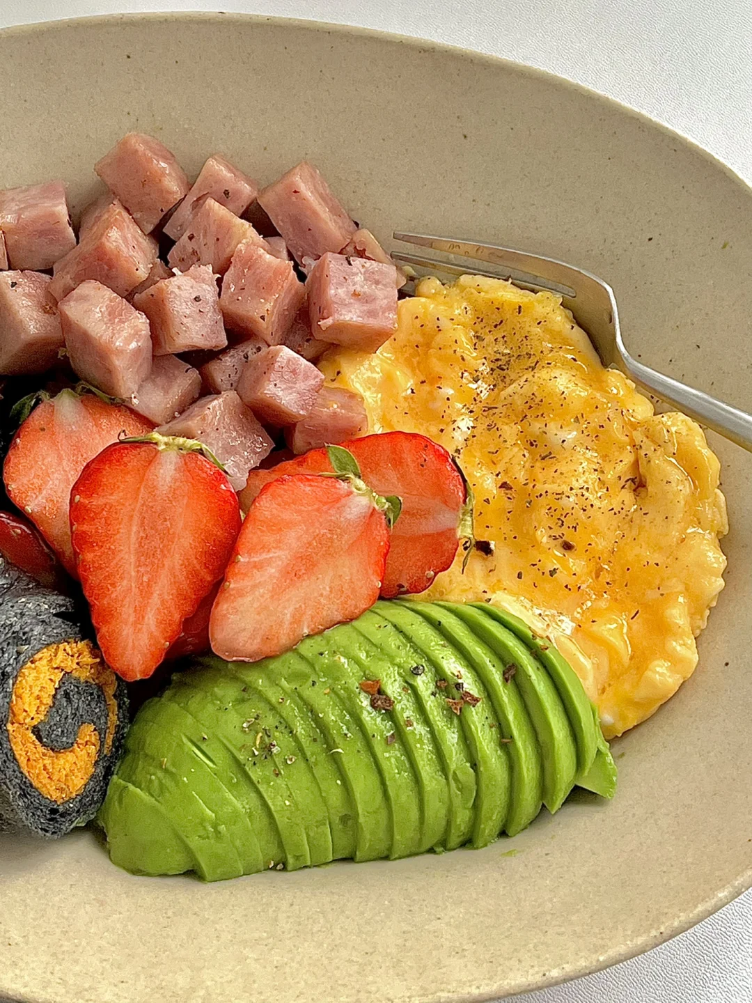 热气腾腾的三餐 今日份早餐分享: 黑金肉松贝果 煎午餐肉粒 牛奶滑蛋 草莓🍓牛油果🥑 . 工作日早餐一盘端系列 这个贝果有点大,吃了半个 午餐肉是纯肉无淀粉的所有控制体重期间也可以吃哦 每天必备的鸡蛋少不了 补充优质蛋白就靠牛油果🥑 这一盘热量不高,饱腹感十足,最重要的是简单快手!