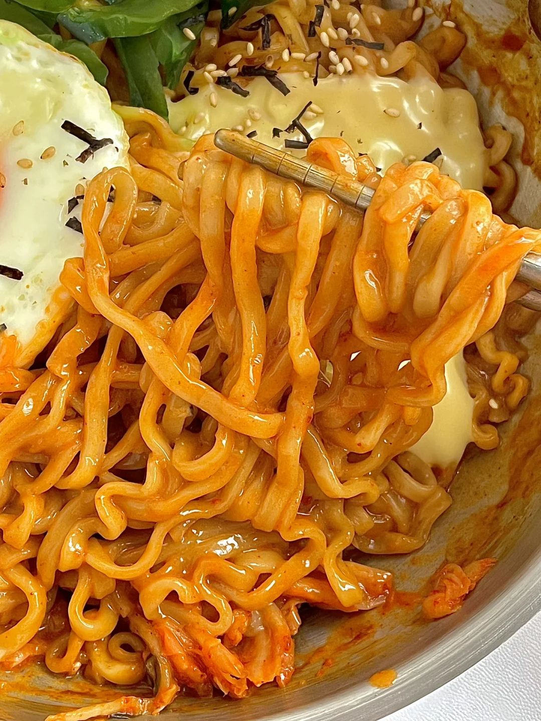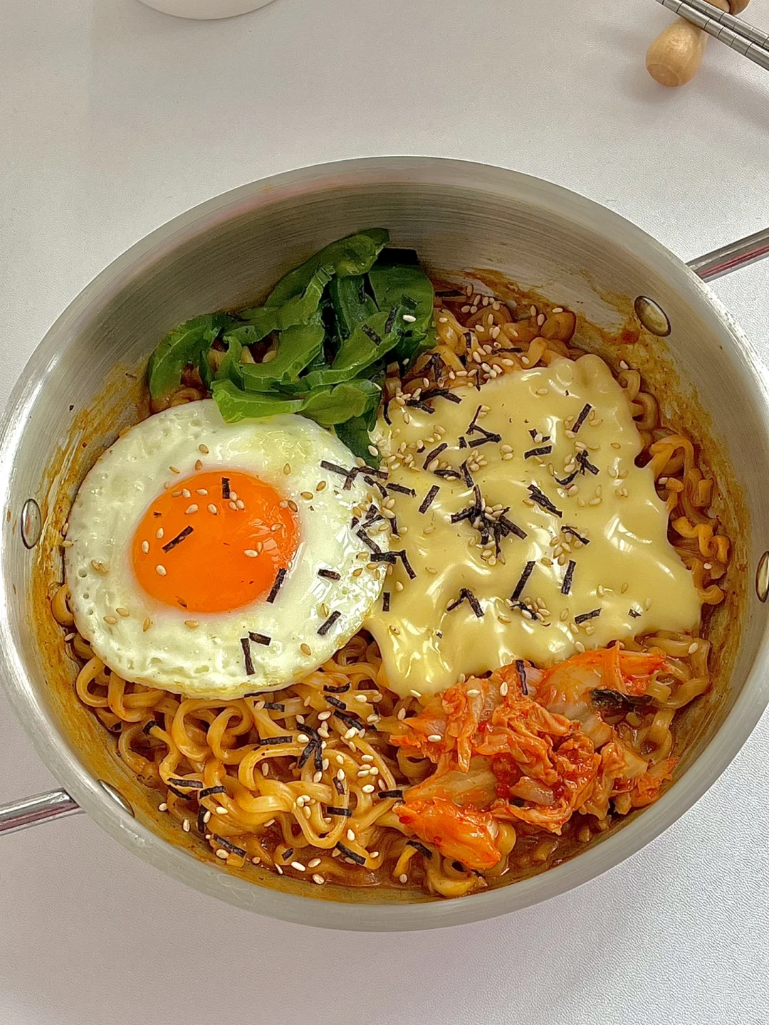 今日份早午餐分享: 芝士牛奶火鸡面 放了煎蛋🍳和小菜 一杯热拿铁☕️ . 今天是北方的小年,祝大家小年快乐呀! 南方是明天小年,入乡随俗所以我明天再过,哈哈 好久没吃火鸡面了,放了牛奶的火鸡面就不会那么辣还有浓浓的奶香味,我真的太爱黏糊的面条了😋