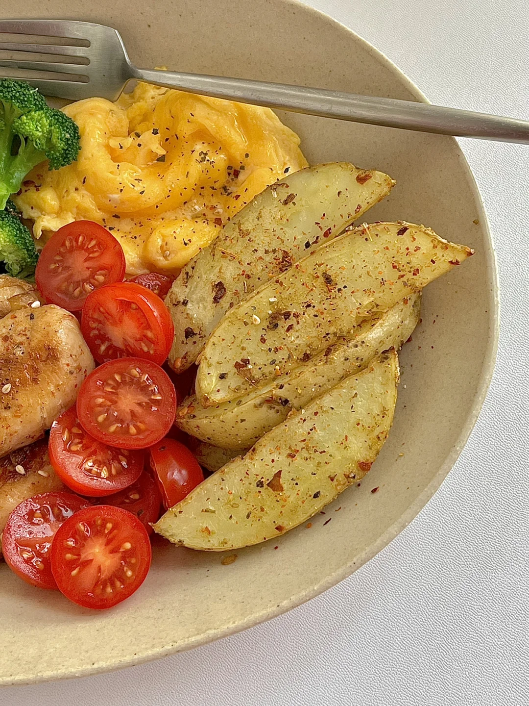 2️⃣一个土豆洗干净我没去皮,切成块,放入保鲜袋,放橄榄油 海盐黑胡椒 孜然粉 辣椒粉拌均匀。